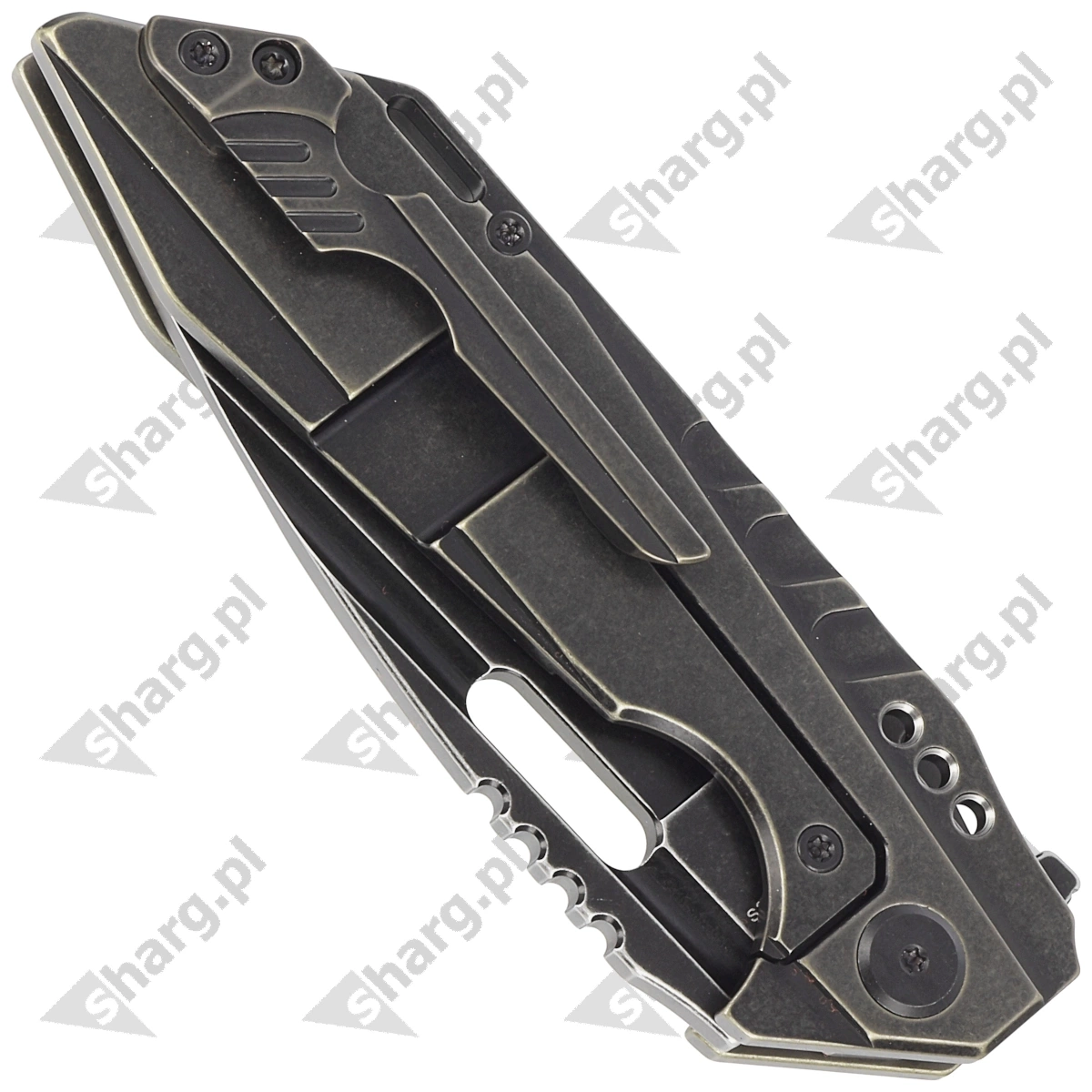 Głownia - szeroka, typu Spear Point z maskujacym rysy wykończeniem Stonewashed które zostało pokryte czarną powłoką. Wydatny brzusiec wydłuża długość krawędzi tnącej w stosunku do długości klingi zbiegając się w kierunku ostrego jak igła czubka noża. Grubość klingi zapewnia wysoką wytrzymałość podczas gdy wysoki, płaski szlif daje doskonałą geometrię krawędzi tnącej oraz ekstremalną wydajność cięcia. Dodatkowym wzmocnieniem jest długie zbrocze. Ceramiczne łożyska kulkowe wspomagają otwarcie ostrza za pomocą szybkiej płetwy flippera (index-finger flipper) po otwarciu pełniącej funkcję jelca. Nóź możemy również otworzyć przy użyciu otworu w klindze (thumb hole). Całość blokowana jest sprawdzoną i popularną blokadą frame lock ze stalową wkładką zabezpieczającą przed wycieraniem czoła blokady.