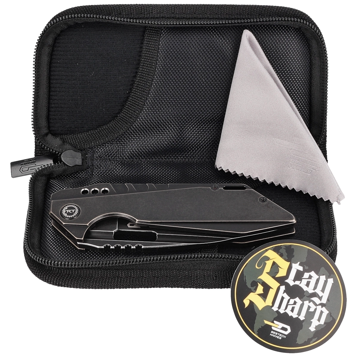 Futerał - nóż zapakowano w zapinany zamkiem nylonowy miękki pouch z logo marki służący do bezpiecznego przenoszenia i przechowywania foldera.