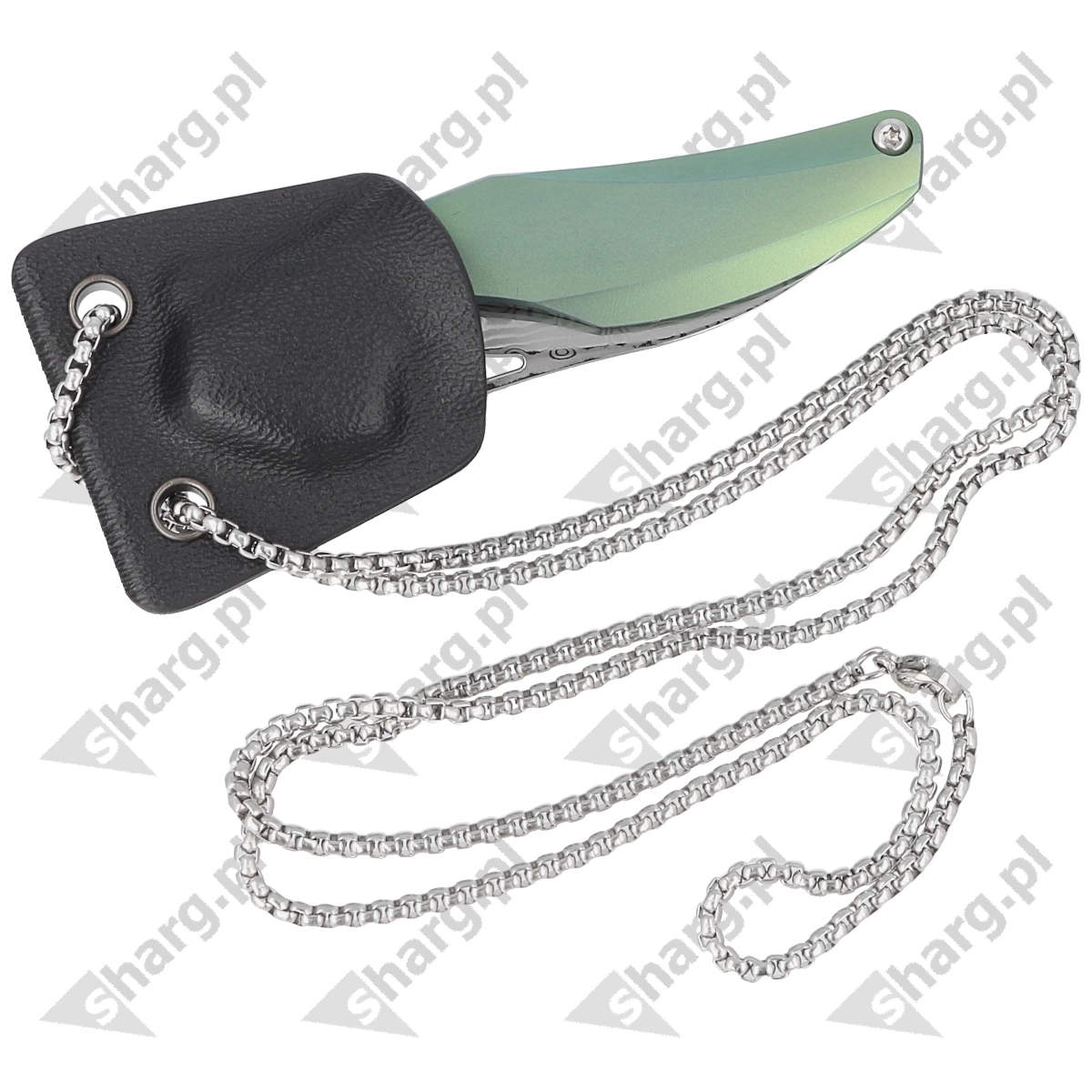 • Reticulan Green Titanium, Damascus, najwyższej jakości nóż EDC projekt Elijaha Ishama. Agresywna głownia Sheepfoot z damastu o niepowtarzalnym wzorze. Otwierany szybką płetwą Flippera, okładziny z tytanu, ceramiczne łożyska, pochwa do zawieszania na szyi