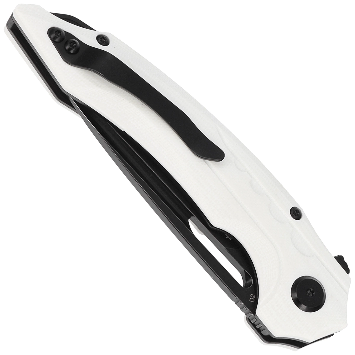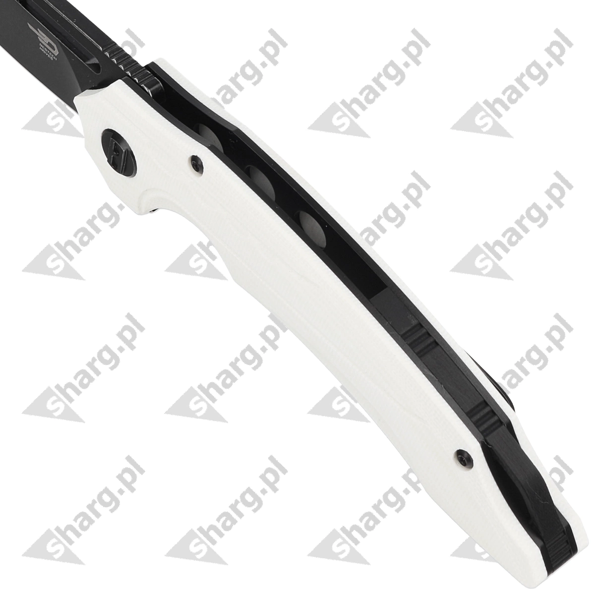 Rękojeść - mocno zakrzywiona rękojeść z białego kompozytu G10 (włókno szklane prasowane pod ciśnieniem z żywicą syntetyczną) zapewnia doskonały uchwyt w wielu pozycjach. Fazowane krawędzie okładek eliminują ostre krawędzie. Przykręcane do solidnego, stalowego backspacera, w jego górnej części otwór na linkę zabezpieczającą lub ozdobną. Oś pivota zdobi stylizowana litera "B". Jednopozycyjny, prawostronny klips deep carry pozwala przenosić dyskretnie nóż w kieszeni w pozycji tip-up (czubkiem ostrza do góry). Podcięcie na palec (fore finger groove) poprawia pewność uchwytu.