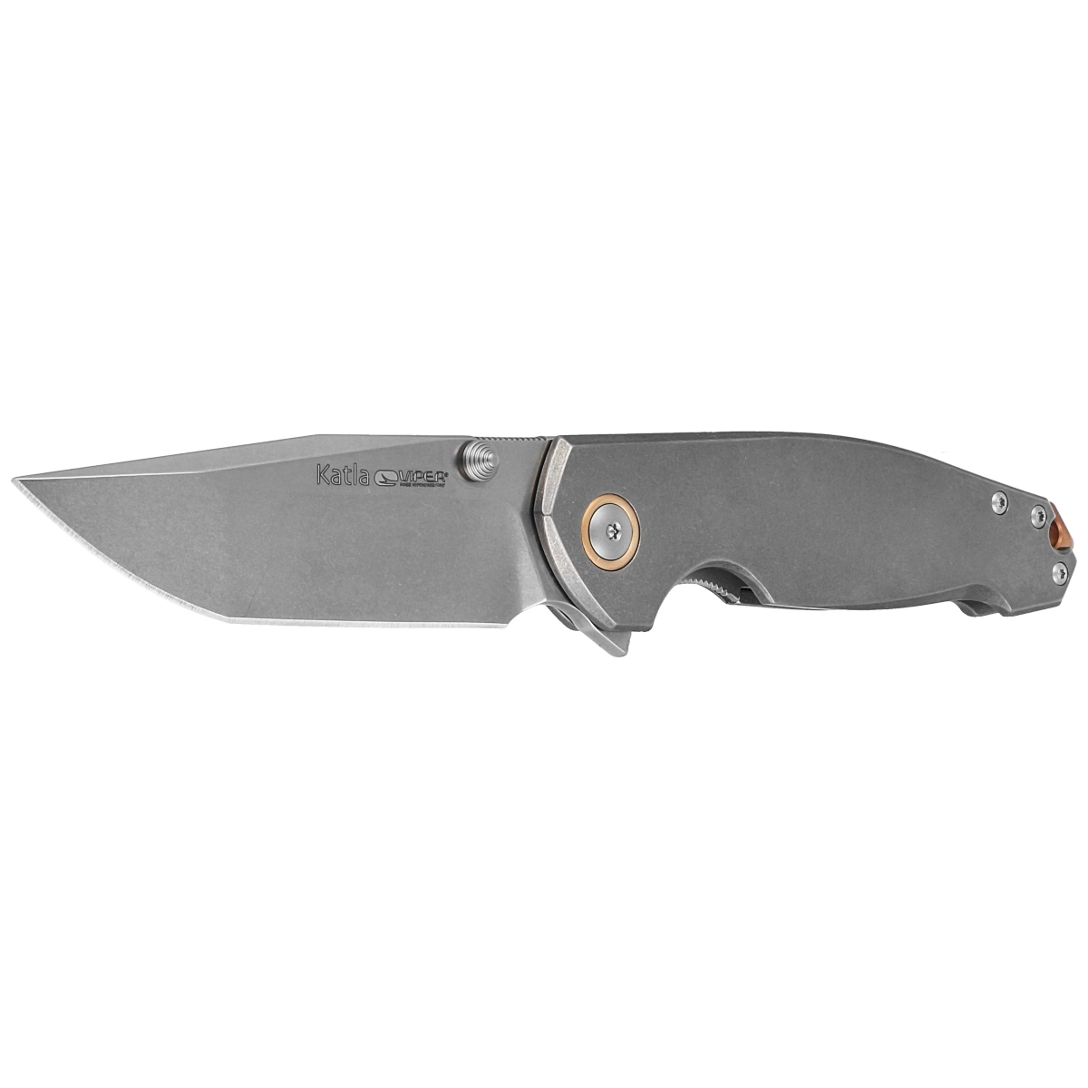 - Katla Gray Titanium, Stonewashed wyjątkowy nóż skierowany do wymagających odbiorców, łączy elegancki styl z najlepszymi materiałami. Projekt Jesper'a Voxnaesa scala w sobie 2 różne opcje otwarcia klingi, głęboki klips, legendarną jakość marki Viper