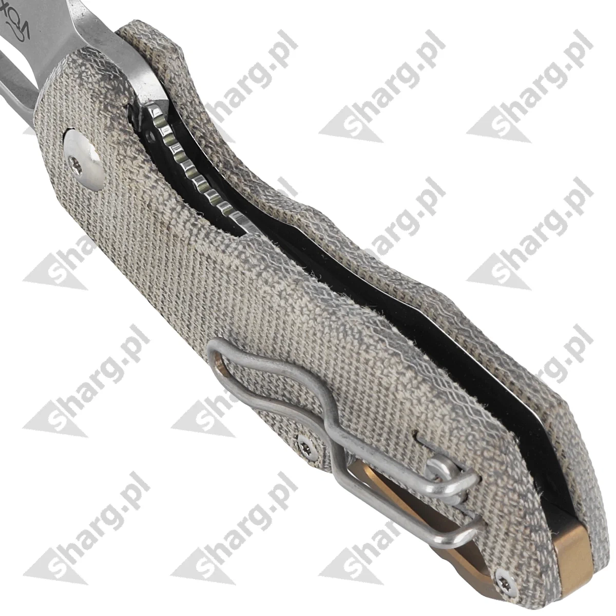 Rękojeść - okładziny z frezowanej obrabiarkami CNC Canvas Micarty, praktycznie niezniszczalnego tworzywa niewrażliwego na warunki atmosferyczne, odpornego na chemikalia i uszkodzenia mechaniczne. Przykręcona do backspacera w kształcie karabińczyka, głęboko teksturowanego dla poprawienia uchwytu. Backspacer oraz ozdobny pierścień wokół pivota tzw. pivot collar wykonano z anodyzowanego na brąz tytanu. Dwupozycyjny lewo / prawostronny kompaktowy klips z drutu stalowego (deep-pocket wire clip) umożliwia przenoszenie noża w pozycji tip-up (czubkiem ostrza do góry).
