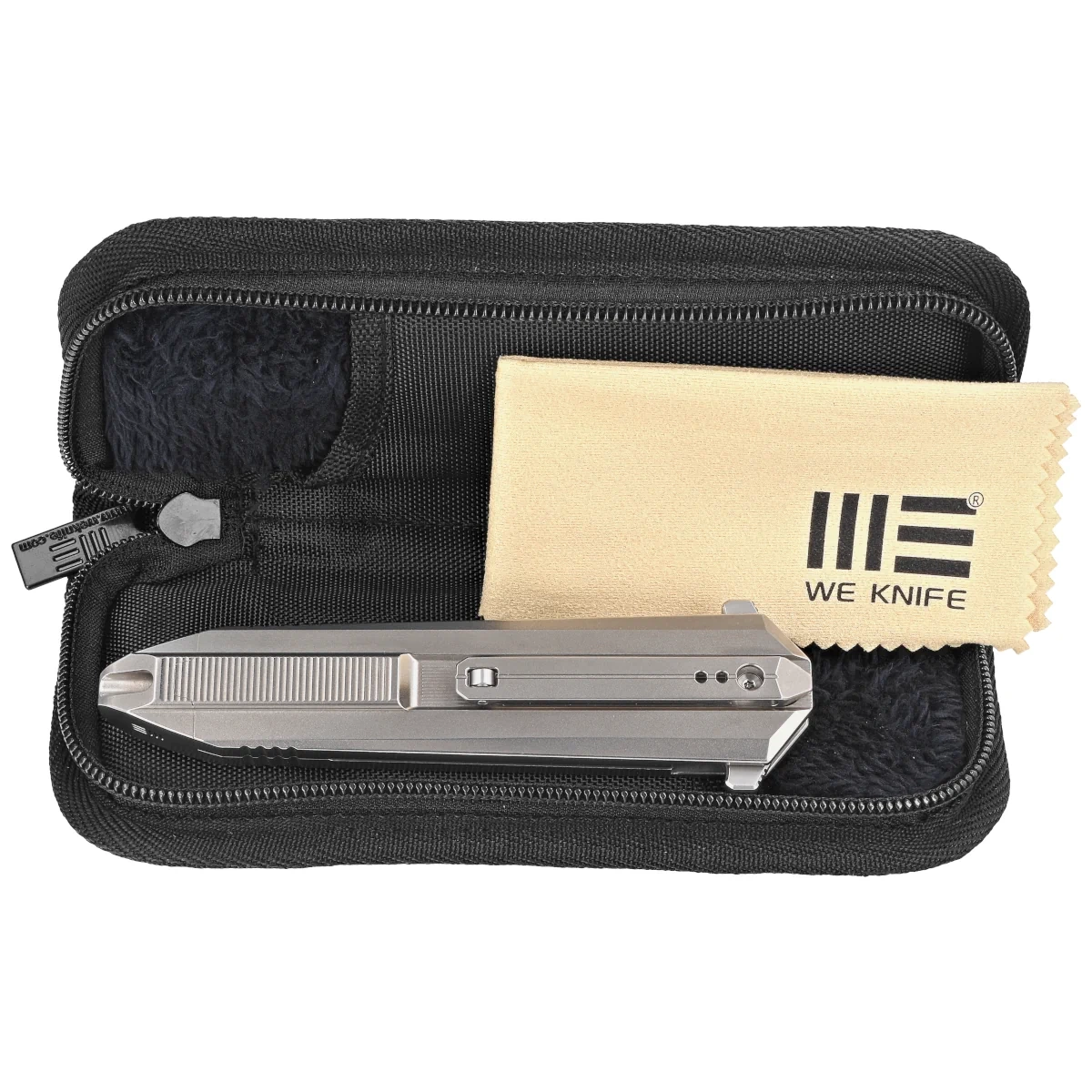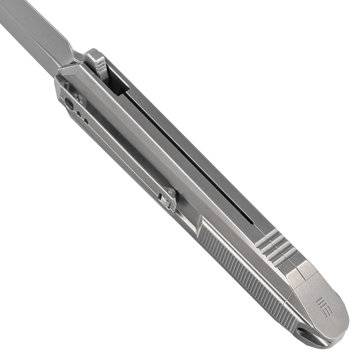 Rękojeść - to popis innowacyjności inzynierskiej projektantów z WeKnife. Dwa kawałki tytanu 6AL4V, pięknie frezowane łączy na końcu tytanowa nasadka z jednego kawałka tytanu. Dzięki temu rękojeść zachowuje niebywałą sztywność i odporność. Tylko nieliczne firmy są w stanie wykonać rękojeść z tak nieprawdopodobną dokładnością! Kolejna innowacja to umieszczone symetrycznie po obu stronach noża klipsy do przenoszenia. Koniec z odkręcaniem śrubek i przekładaniem, nóż możemy nosić po prawej i lewej stronie w tej samej pozycji. Dodatkowym smaczkiem jest zakończenie klipsów rolką, dzięki czemu ułatwione jest wsuwanie i zaczepianie noża o brzeg materiału.
