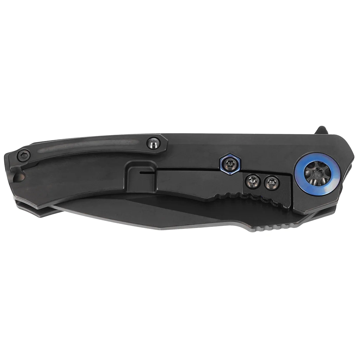 Głownia - szeroka, typu Drop Point S/E (Single Edge), trwałość powierzchni zwiększono czarną powłoką DLC z wykończeniem Battleworn. Wydatny brzusiec wydłuża długość krawędzi tnącej w stosunku do długości klingi zbiegając się w kierunku ostrego jak igła czubka. Solidna grubość ostrza w połączeniu z wysokim płaskim szlifem (Flat Grind) daje doskonałe właściwości tnące połączone z wysoką wytrzymałością. Nóż można otworzyć za pomocą płetwy flippera (index-finger flipper). Aby zachować pełną kontrolę nad ostrzem, na grzbiecie klingi upper jimping, karbowane oparcie pod kciuk. Całość blokowana jest sprawdzoną i popularną blokadą frame lock ze stalową wkładką zabezpieczającą przed wycieraniem czoła blokady.