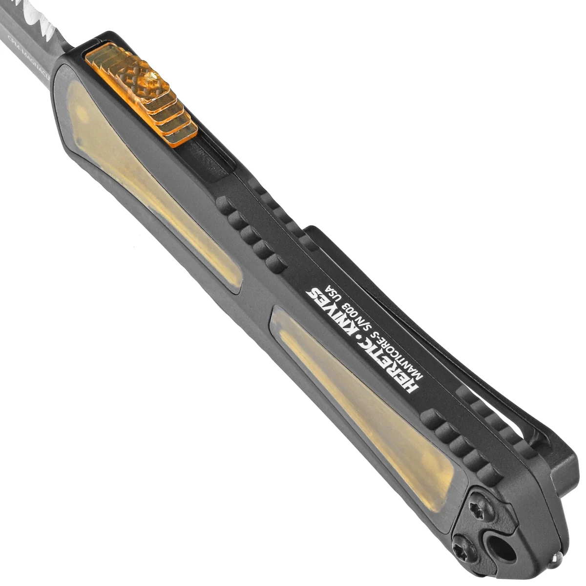 Nóż automatyczny OTF Heretic Manticore S DE Black Aluminum / Ultem, Black DLC Full Serrated MagnaCut by Tony Marfione Jr.