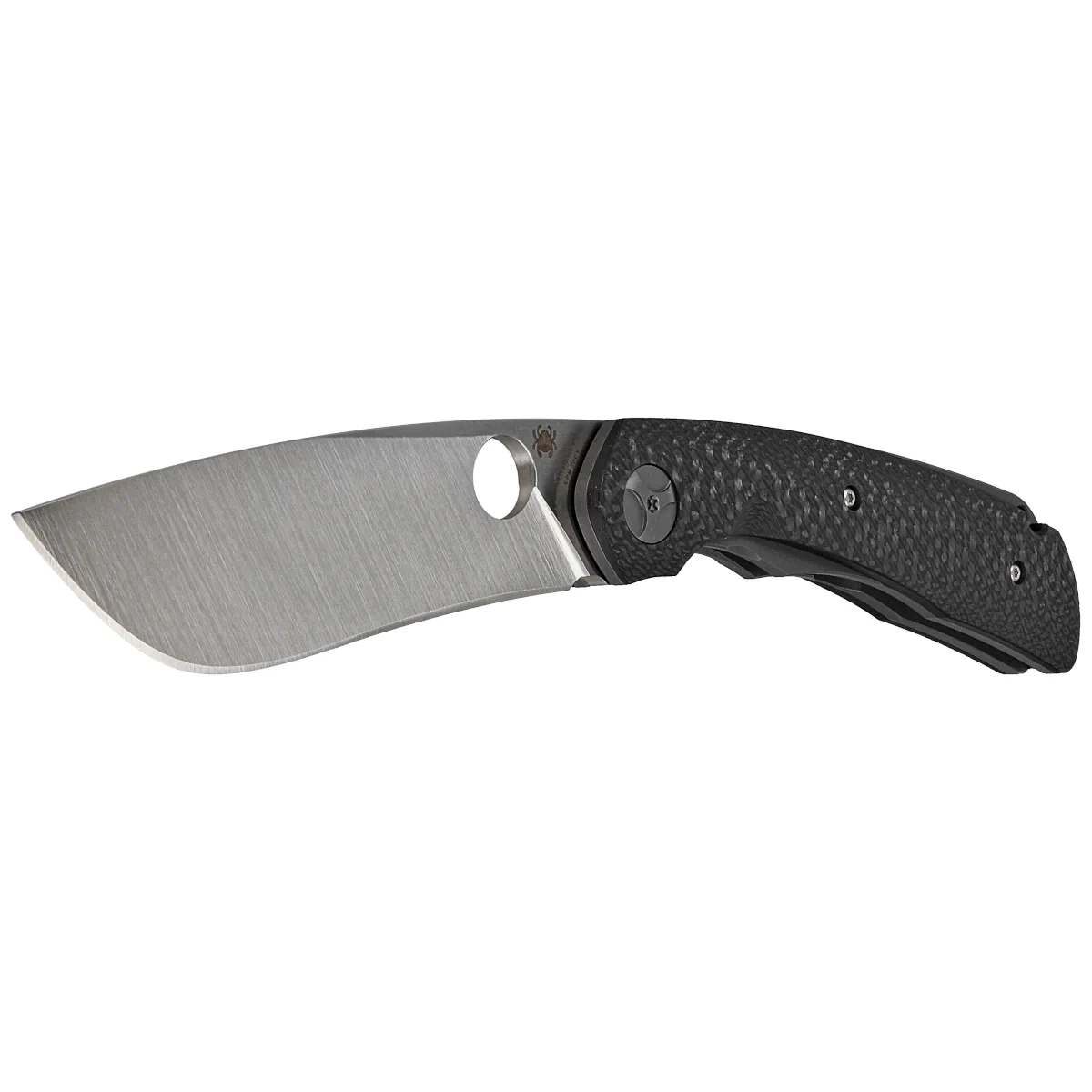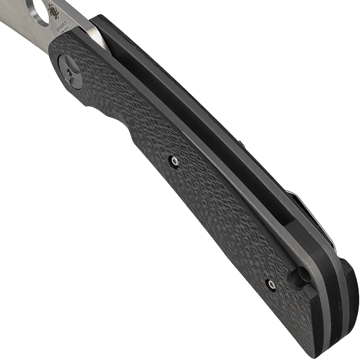 Głownia - szeroka, typu Drop Point, wykończona elegancką metodą Satin. Wydatny brzusiec wydłuża długość krawędzi tnącej w stosunku do długości klingi zbiegając się w kierunku ostrego jak igła czubka. Solidna grubość ostrza w połączeniu z pełnym płaskim szlifem (Full Flat Grind) daje doskonałe właściwości tnące połączone z wysoką wytrzymałością. Łożyska kulkowe wspomagają płynne otwarcie ostrza, które można otworzyć za pomocą okrągłego wycięcia SpyderHole (patent Spyderco). Dzięki temu mogą z niego bez problemu korzystać osoby prawo i leworęczne. Całość blokowana jest sprawdzoną i popularną blokadą liner lock.