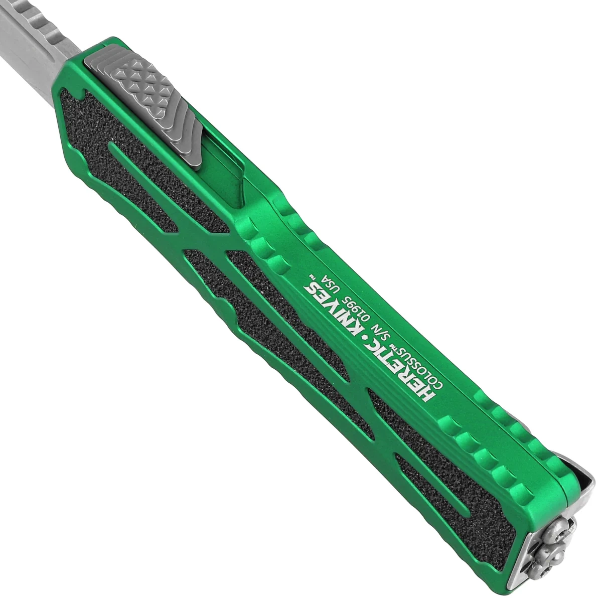 Colossus TE Green Aluminium, Stonewashed jeden z najlepszych noży automatycznych OTF (Out The Front). Charakteryzuje się doskonałym dopasowaniem i wykończeniem, jakiego można oczekiwać od noża z najwyższej półki. Automat o ponadprzeciętnej wytrzymałości pracuje w trybie D/A (Double Action) wykorzystując działający z ogromną siłą i mocą, oczekujący na opatentowanie mechanizm otwierania noża. W mechanizmie zastosowano łożyska kulkowe zmniejszające tarcie i zapewniające szybkie, płynne blokowanie ostrza. Wstawki zwiększające przyczepność po obu stronach aluminiowej rękojeści zapewniają zarówno styl, jak i funkcjonalność. Projekt Anthony'ego Marfione Jr. właściciela Heretic Knives.