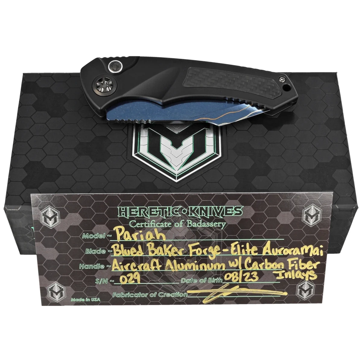 Pariah-A Custom, DLC Aircraft Aluminium / Carbon Fiber Inlays, Blued Baker Forge AuroraMai Damascus nóż sprężynowy custom. Limitowana edycja Pariah-Auto noża automatycznego typu swichblade o numerze S/N 029 i dacie 08/23. Zaprezentowany na wystawie USN 2023, zniknął w mgnieniu oka wykupiony przez dealerów firmy. Ręcznie szlifowana i ostrzona głownia z damastu AuroraMai, składana przez wykwalifikowanych rzemieślników to piękny wygląd i wyjątkowe możliwości cięcia. Folder scala w sobie niezwykle mocną budowę, ekskluzywne materiały oraz legendarną jakość wykonania z której słynie kultowa marka Heretic Knives. Wersja custom Anthony'ego Marfione Jr.