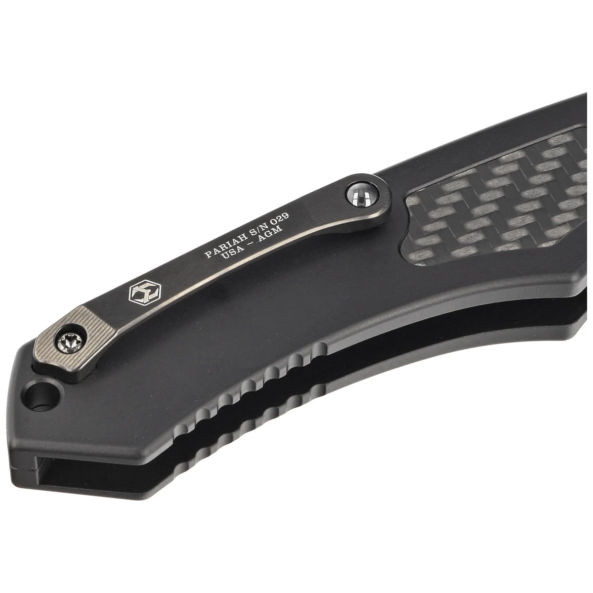- Pariah-Auto Custom DLC Aluminium / Carbon Fiber Inlays, Blued Baker Forge AuroraMai Damascus S/N 029. Limitowana edycja noża automatycznego Pariah, zaprezentowana na wystawie USN 2023! Absolutny top niezwykłych materiałów w perfekcyjnym wykonaniu!