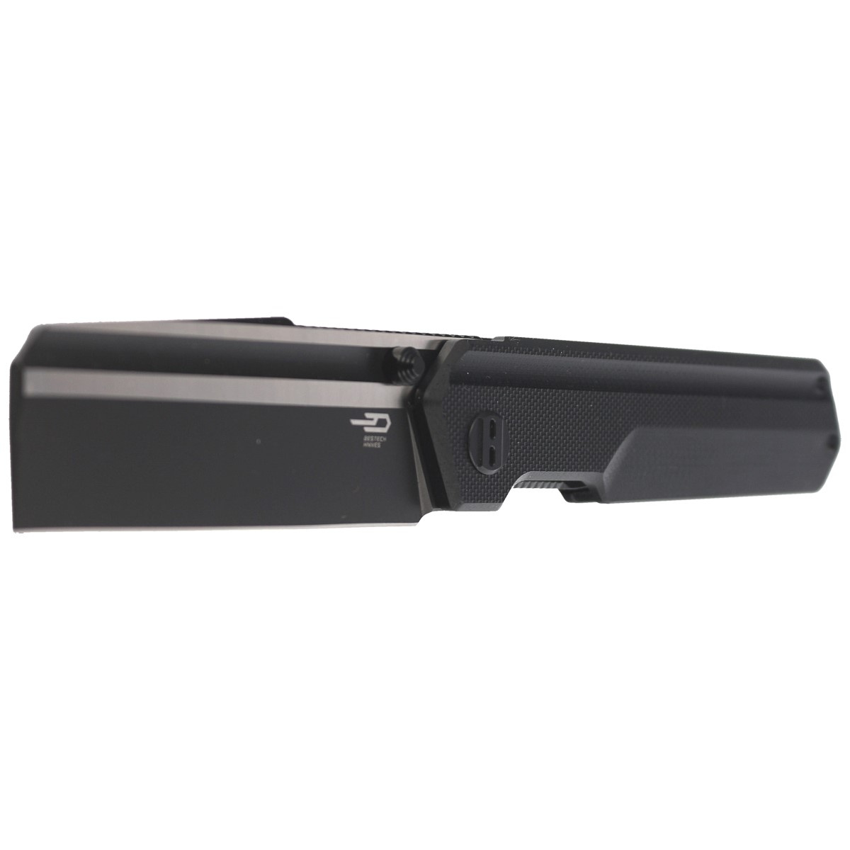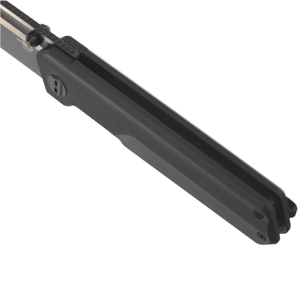 Głownia - typu Cleaver (tasak) z eleganckim wykończeniem Two Tone, szlify pokryte czarną powłoką DLC, pozostała część satynowana. Prosta linia krawędzi tnącej zbiega się w kierunku płaskiego, bezpiecznego zakończenia klingi. Grubość klingi w połączeniu z wysokim, płaskim szlifem daje doskonałą geometrię krawędzi tnącej oraz ekstremalną wydajność cięcia. Ceramiczne łożyska kulkowe wspomagają otwarcie ostrza za pomocą obustronnego kołka w klindze (dual thumb stud). Fragment grzbietu klingi pokryto upper jimping, karbowanym oparciem pod kciuk ułatwiającym kontrolę nad nożem. Całość blokowana jest sprawdzoną i popularną blokadą liner lock.