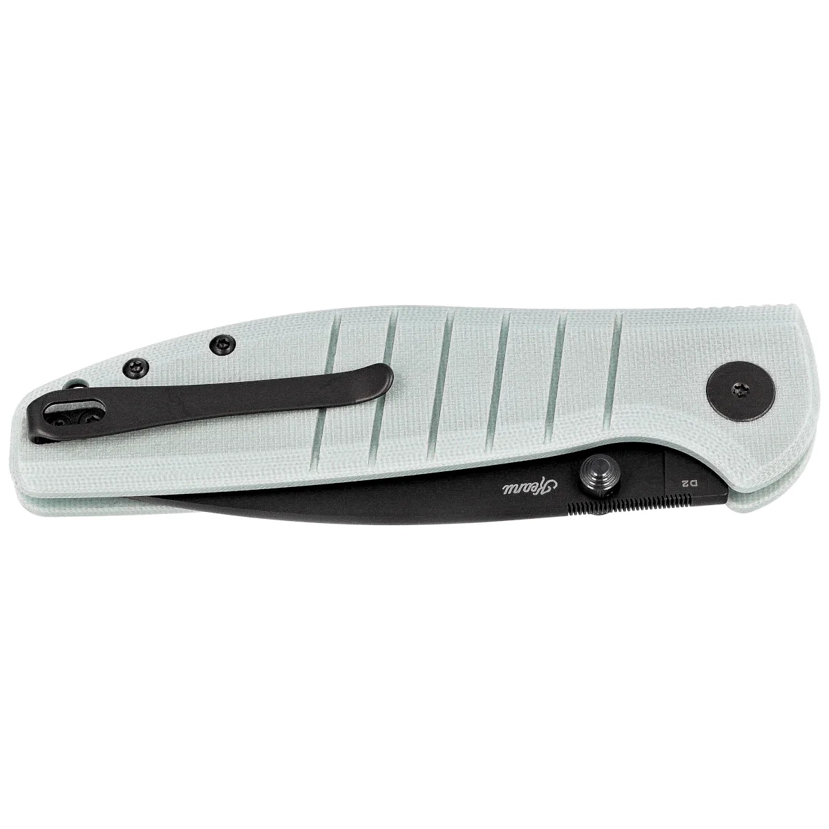 Rękojeść - wykonana z G10, kompozytowego materiału z włókna szklanego prasowanego pod ciśnieniem z syntetyczną żywicą. Agresywna tekstura okładzina zapewnia pewny chwyt, nawet mokrymi dłońmi. Fazowane krawędzie okładek eliminują ostre krawędzie dla wygody, a wykonany z przodu podcięcie na palec poprawia ergonomię. Otwarta konstrukcja tzw. open-backed mocowana stalowymi tulejami dystansowymi redukuję wagę oraz ułatwia czyszczenie. Dwupozycyjny, prawo/lewostronny klips deep carry pozwala przenosić dyskretnie nóż w kieszeni w pozycji tip-up (czubkiem ostrza ku górze).