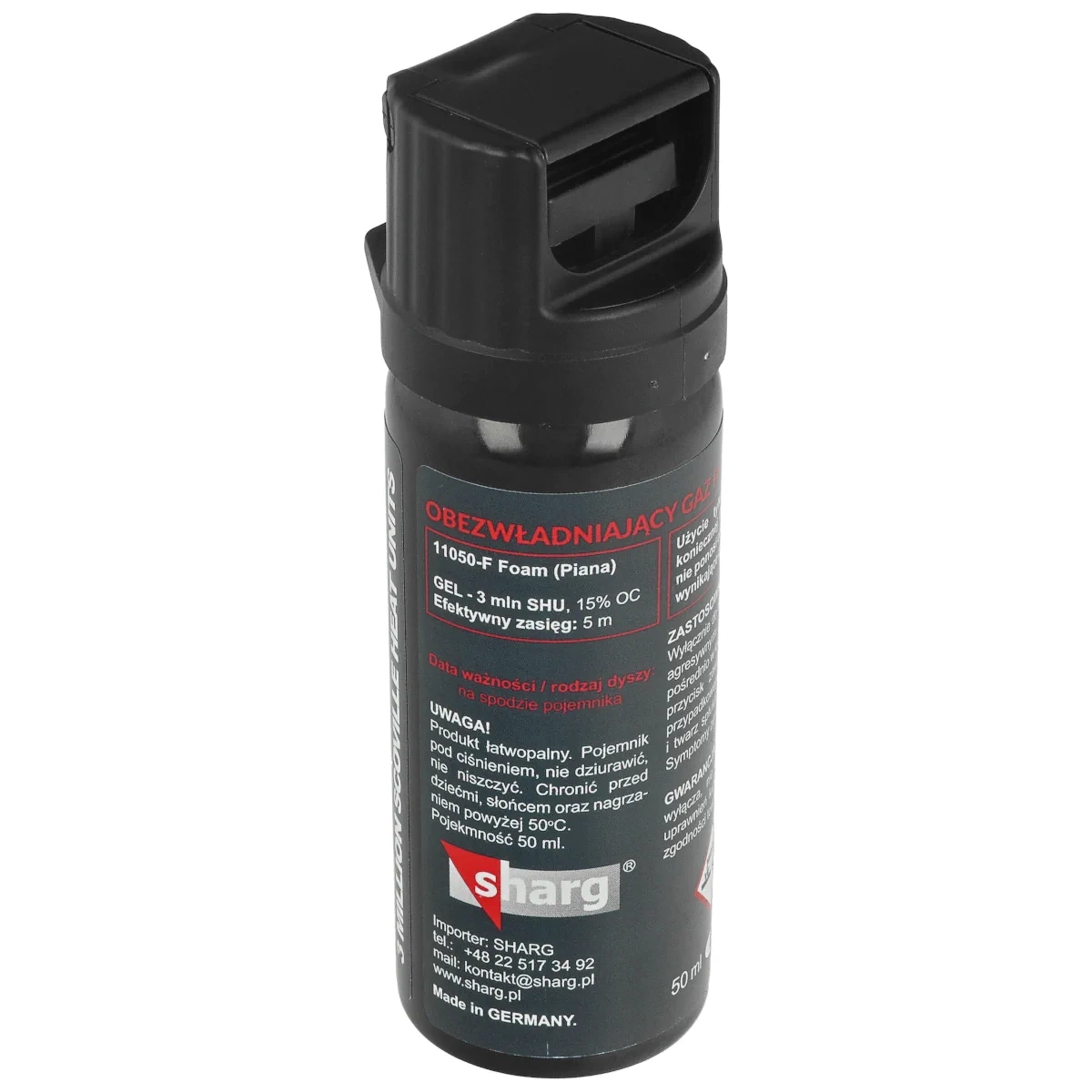 Sharg Graphite Red Pepper Foam 3mln SHU Stream to jeden z najmocniejszych gazów obezwładniających dostępnych na rynku. Stężenie substancji aktywnej 15% OC (Oleoresin Capsicum) w tym 1.95% MC (Major Capsaicinoids), ostrość 3 mln SHU (Scoville Heat Units). Zawiera środek obezwładniający w formie piany. Umożliwia skuteczną obronę przed napastnikiem/grupą napastników, również pod wpływem alkoholu lub środków psychoaktywnych oraz agresywnymi zwierzętami. Wyprodukowany w Niemczech, pojemność 50 ml.