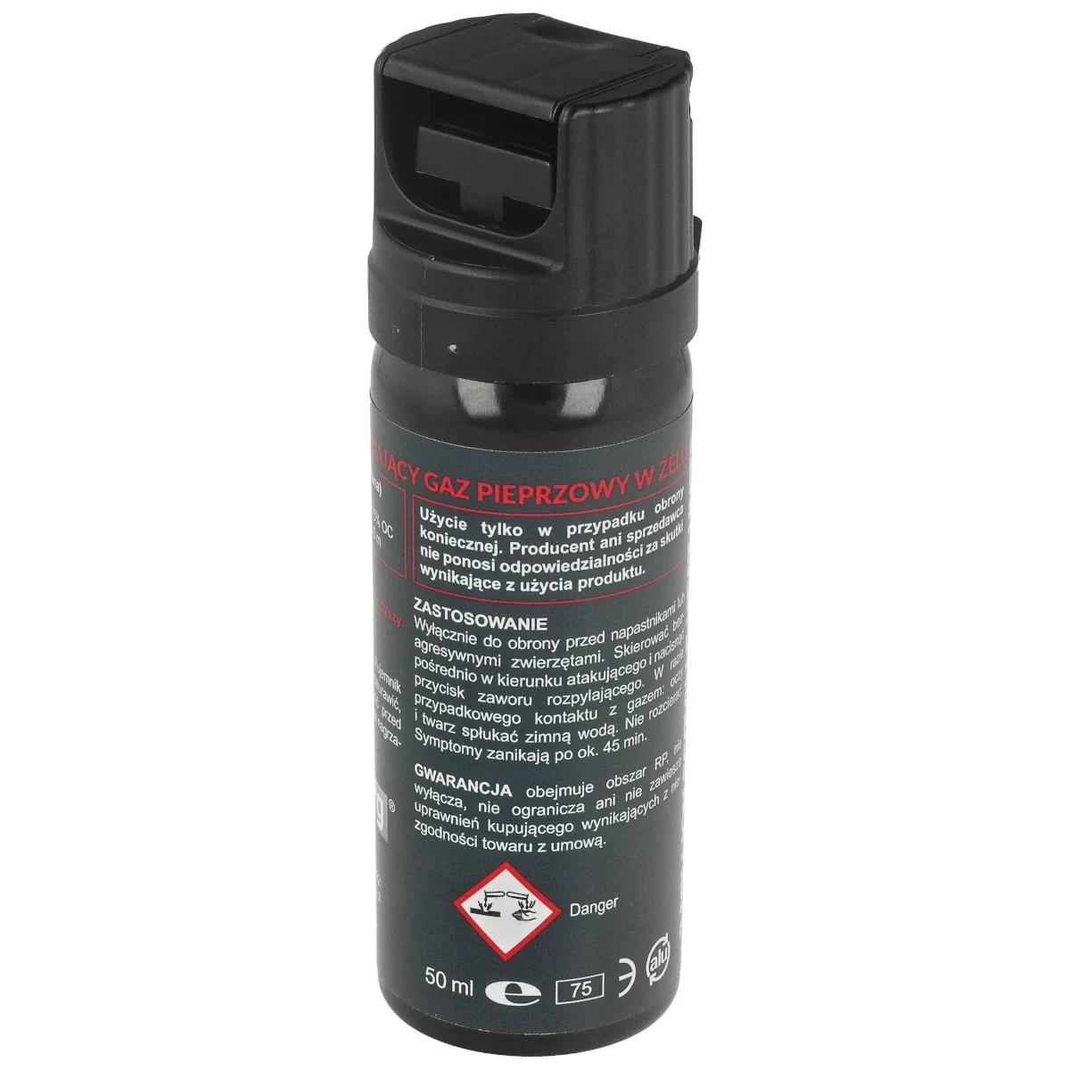 Ważne! Produkt zawiera środek drażniący OC (oleoresin capsicum czyli kapsaicyę alkalidową). Powoduje silną reakcją alergiczną: łzawienie, zaczerwienienie skóry, a także silne pieczenie śluzówek. W przypadku kontaktu z gazem należy przemyć oczy oraz twarz zimną wodą. Nie rozcierać. Objawy ustąpią po ok. 45 min.