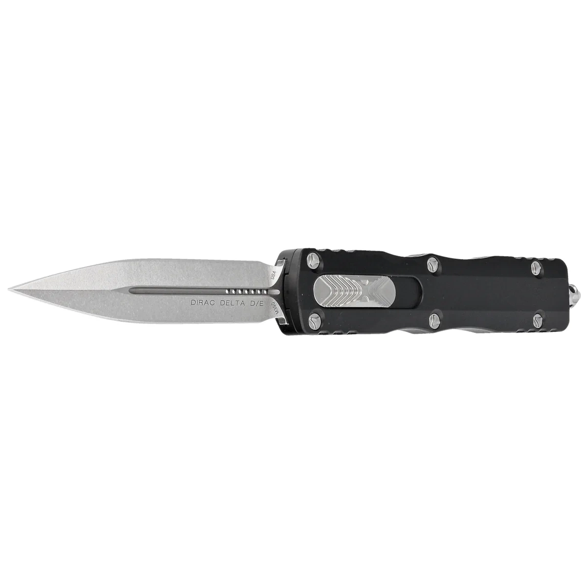 - Dirac Delta D/E Black Aluminium, Stonewashed większa wersja noża automatycznego OTF z serii Dirac. Pracujący w trybie D/A, wyposażony w szybki mechanizm wysuwający ostrze. Przycisk slidera na boku rękojeści. Projekt Tony Marfione, Microtech Knives