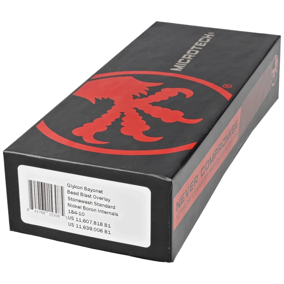 Glykon D/E Bayonet Black Aluminium / Bead Blast Titanium, Stonewashed to duży nóż automatyczny OTF (Out The Front) z serii Glykon. Pierwszy automat OTF z trójstronnym przyciskiem, umożliwiającym pełną obsługę oburęczną, wyposażony w piekielnie szybki mechanizm wysuwający ostre jak brzytwa ostrze. W 100% wyprodukowany i zmontowany w USA. Projekt Anthony'ego i Seana Marfione z Microtech Knives.