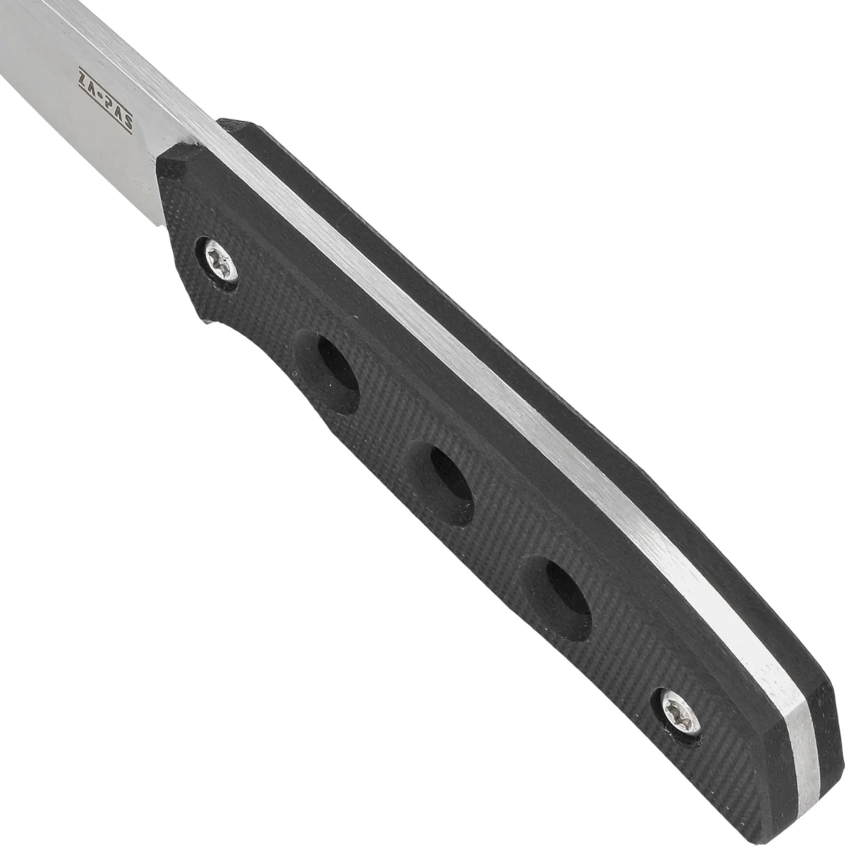 Ambro Black G10, Satin kompaktowy nóż EDC polskiej manufaktury ZA-PAS Knives, odpowiedni na każdą wyprawę w teren. Ze względu na swoje wymiary oraz niską wagę niesamowicie poręczny i łatwy w przenoszeniu, bez utraty cech pełnowymiarowego noża bushcraftowego. Nóż outdoorowy o konstrukcji full tang z głownią ze stali nierdzewnej 1.4116S, skierowany do pasjonatów survivalu, myślistwa, miłośników każdej pozostałej aktywności w terenie.