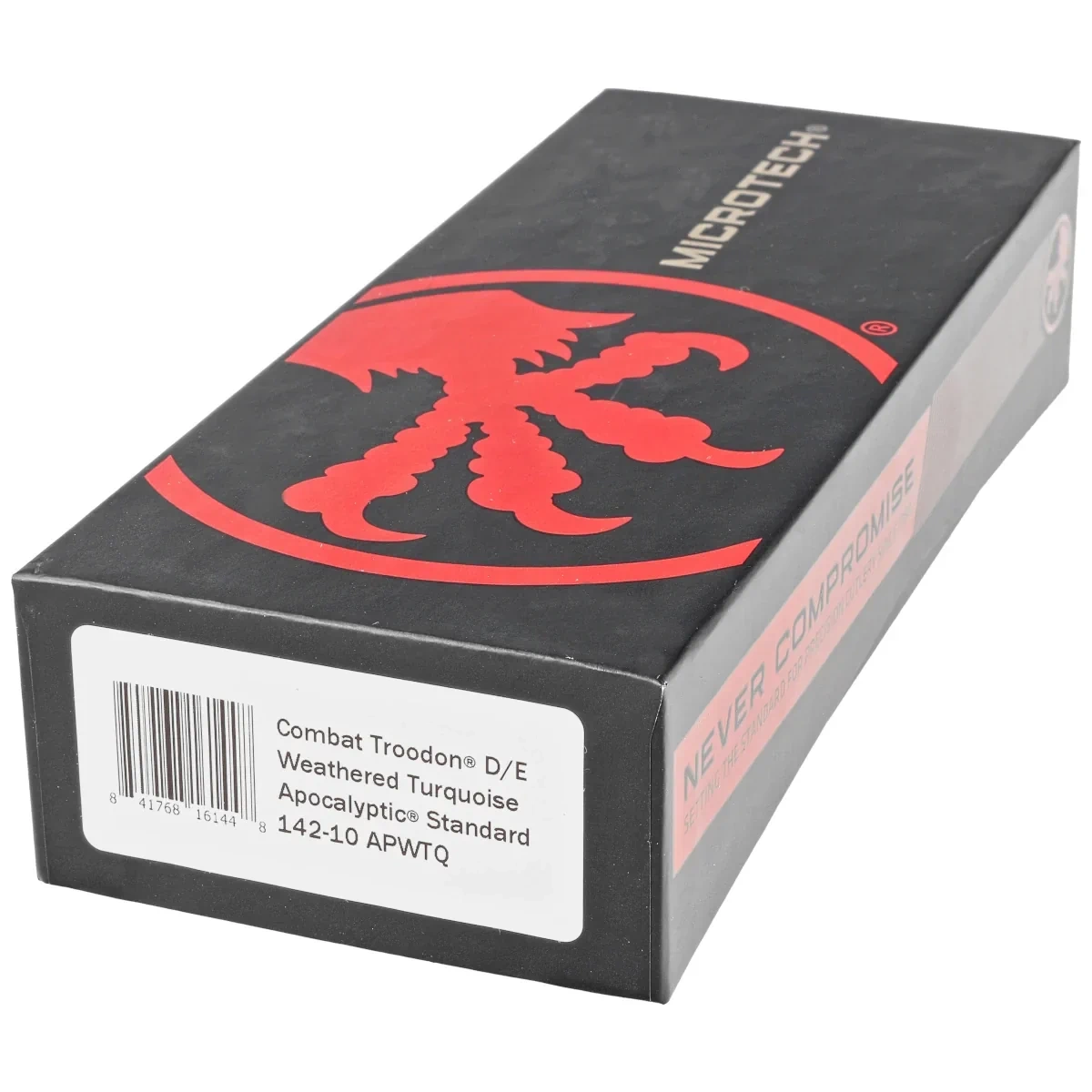 Combat Troodon D/E Weathered Turquoise Aluminium, Apocalyptic to największy nóż automatyczny OTF (Out The Front) z serii Troodon, zbudowany z myślą o szerokim spektrum zastosowań użytkowych. Precyzyjnie wykonany, wyposażony w wyrafinowany i piekielnie szybki mechanizm wysuwający ostre jak brzytwa ostrze. W 100% wyprodukowany i zmontowany w USA. Projekt Anthony'ego Marfione, knifemakera i właściciela Microtech Knives.