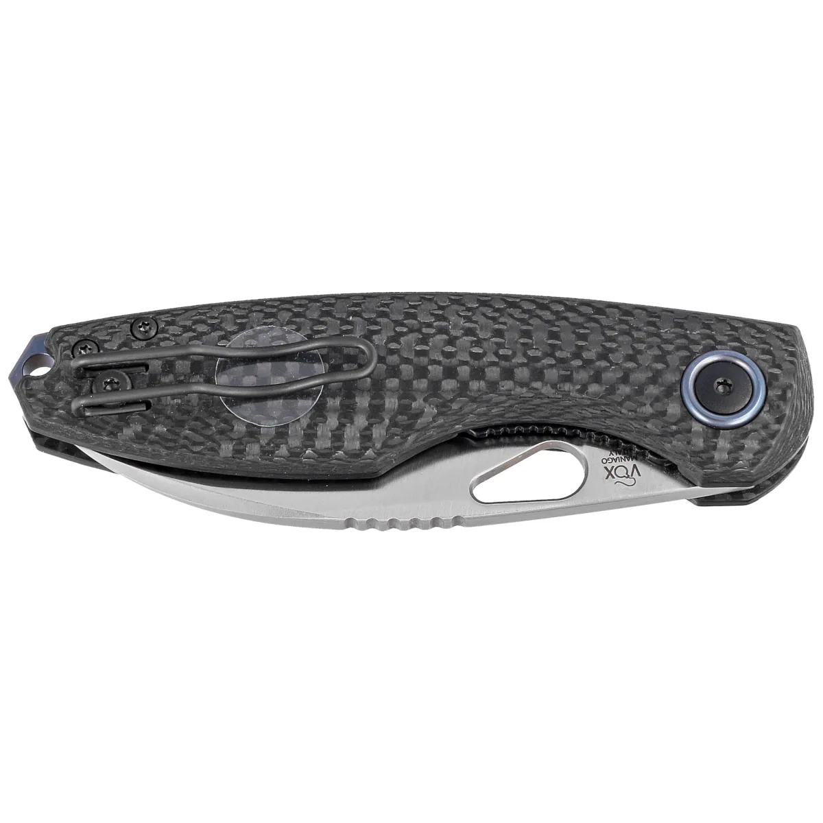 Rękojeść - okładziny z Carbon Fiber (włókno węglowe prasowane pod ciśnieniem z żywicą syntetyczną) o pięknym i niepowtarzalnym wzorze. Fazowane krawędzie okładek eliminują ostre krawędzie dla wygody chwytu. Anodyzowany na niebiesko tytanowy backspacer zapewnia sztywność i solidność całej konstrukcji. Dwupozycyjny (prawa/lewa) lekki klips z drutu (wire clip) umożliwia przenoszenie noża w pozycji tip-up, czubkiem ostrza ku górze. Oś pivota ozdobiona anodyzowaną na niebiesko tytanową obręczą (pivot collar cap). Nad klipsem otwór do przewleczenia linki zabezpieczającej lub ozdobnej.
