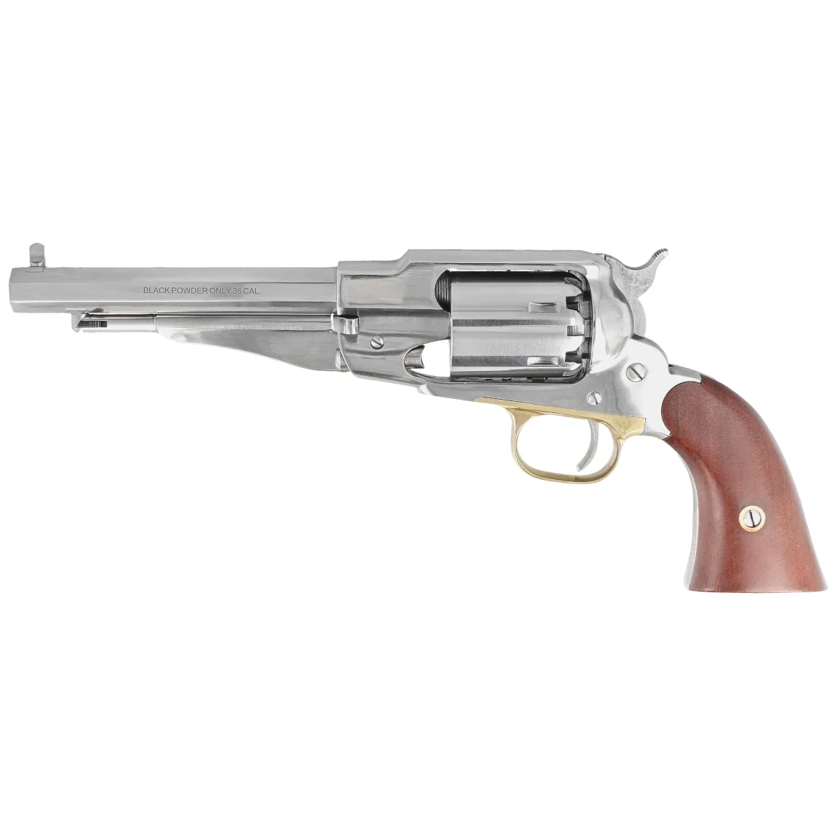 Remington 1858 New Model Navy Inox .36 sześciostrzałowy kapiszonowy rewolwer czarnoprochowy w wersji ze stali nierdzewnej - stanowiącej doskonałe zabezpieczenie przed korozyjnymi właściwościami produktów spalania czarnego prochu. Ładowana odprzodowo replika jednego z najsłynniejszych rewolwerów kapiszonowych firmy Remington. Zamknięta stalowa rama oraz staranne wykonanie mają wpływ na celność i powtarzalność strzałów.