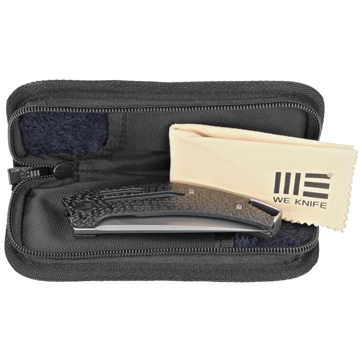 Rękojeść - okładziny z Twill Carbon Fiber (włókno węglowe prasowane pod ciśnieniem z żywicą syntetyczną) o charakterystycznym spiralnym wzorze. Mocowane do stalowych linersów. Fazowane krawędzie okładek eliminują ostre krawędzie. Boki przykręcono do masywnego tytanowego backspacera, dając pewność wieloletniego użytkowania. Oś pivota zdobi stylizowane logo marki WE Knife. Jednopozycyjny (prawa) tytanowy klips deep carry pozwala przenosić dyskretnie nóż w kieszeni w pozycji tip-up (czubkiem ostrza do góry). Z tyłu rękojeści lanyard hole, ukryte w backspacerze miejsce na linkę ozdobną lub zabezpieczającą.