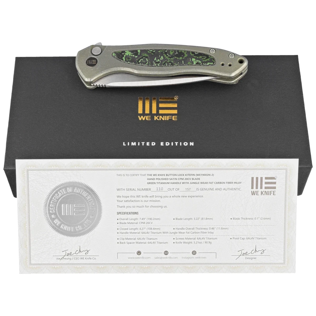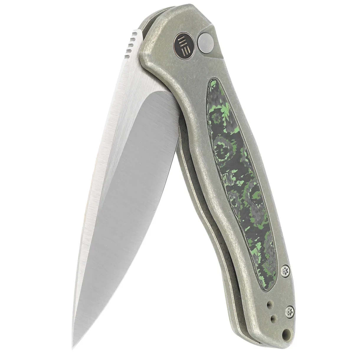 Nóż składany WE Knife Button Lock Kitefin LE No 110/157 Green Titanium/Jungle Wear Fat Carbon, Hand Polished Satin CPM 20CV (WE19002N-2)