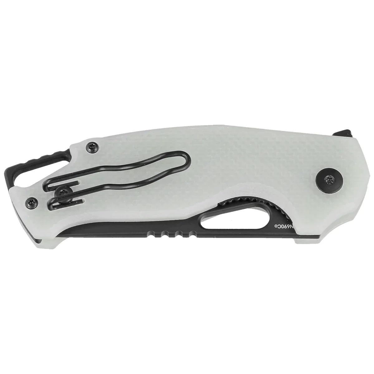 Rękojeść - okładziny z lekko szorstkiego G10, kompozytu włókna szklanego prasowanego pod ciśnieniem z żywicą syntetyczną. Okładziny przykręcono do frezowanego obrabiarkami CNC backspacera z aluminium, takie rozwiązanie zapewnia pożądaną sztywność konstrukcji. Obustronny (prawa/lewa) klips deep carry, pozwala przenosić dyskretnie nóż w pozycji tip-up (czubkiem ostrza do góry). Wystający fragment backspacera tworzy lanyard hole, otwór na linkę, można go również użyć jako improwizowany zbijak do szkła.