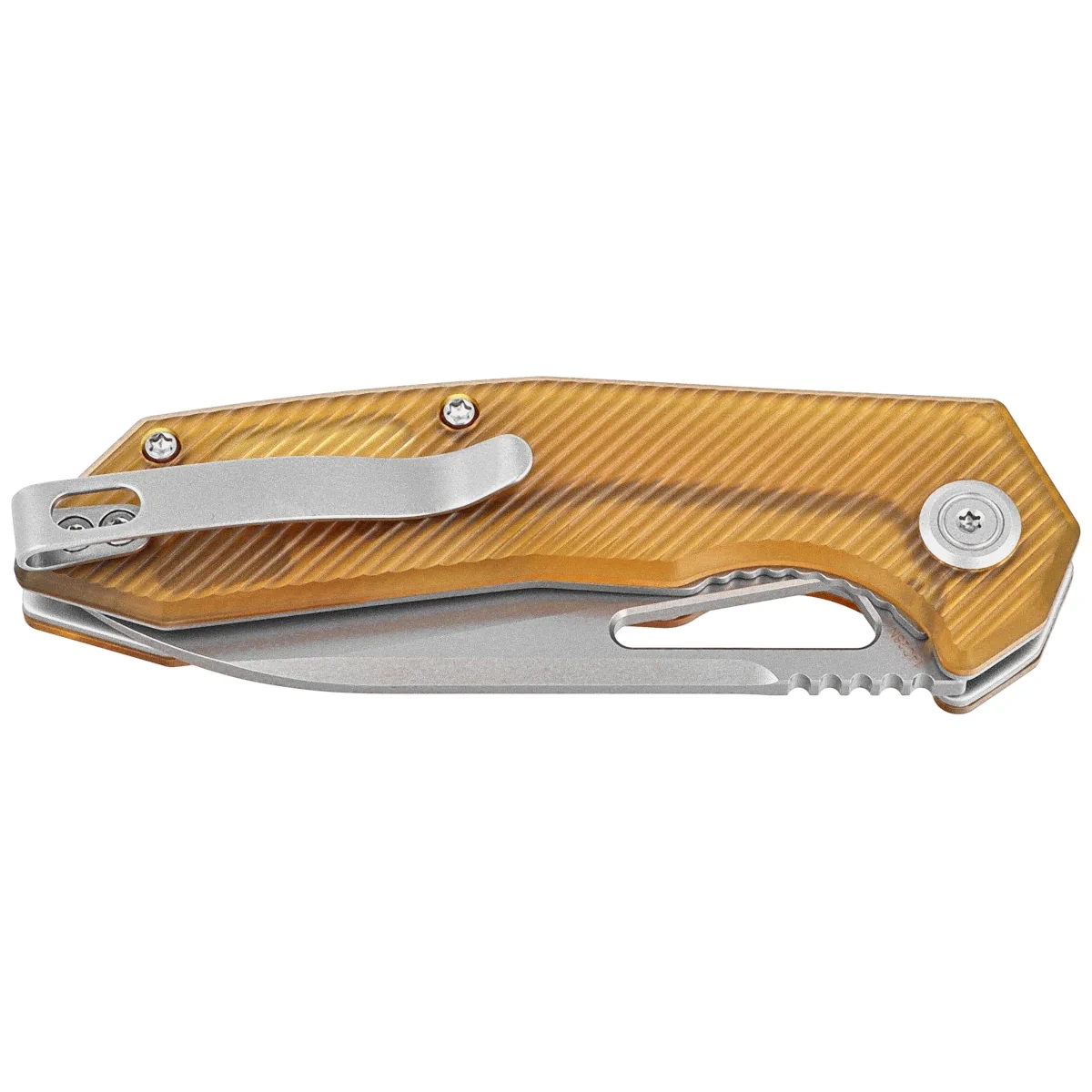 Rękojeść - okładziny z przezroczystego tworzywa Ultem™, teksturowane dla poprawienia pewności uchwytu, przykręcone do stalowej ramy noża. Fazowane krawędzie okładek eliminują ostre ranty dla wygody i poprawiają pewność uchwytu. Otwarta konstrukcja tzw. open-backed bez typowego backspacera, mocowana do siebie stalowymi tulejami dystansowymi ułatwia czyszczenie. Prosta, pewna konstrukcja daje pewność wieloletniego użytkowania. Głębokie podcięcie na palec (fore finger groove) poprawia pewność uchwytu. Oś pivota zdobi stylizowane logo marki Kubey Knife. Dwupozycyjny (prawa.lewa) tytanowy klips deep carry pozwala przenosić dyskretnie nóż w kieszeni w pozycji tip-up (czubkiem ostrza do góry).