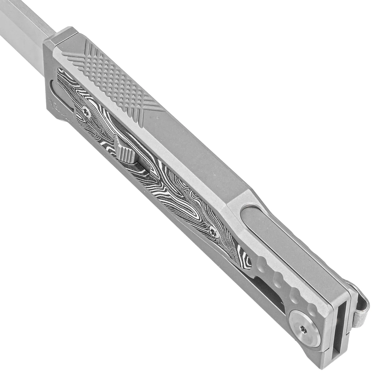 EXO-M Gravity Drop Point Bead Blasted Titanium/Damascus Black-White G10, Satin to intuicyjne otwierany, pomysłowy nóż składany EXO-M (Medium) z legendarnej manufaktury Reate Knives - prawdziwy popis inżynierów w dziedzinie projektowania. Model EXO-M wyposażono w głownią wysuwaną z przodu, aktywowaną siłą grawitacji. Konstrukcja inspirowana jest grawitacyjnym nożem lotniczym Luftwaffe, potocznie nazywanym nożem niemieckich spadochroniarzy. Intuicyjne wysuwanie i wsuwanie ostrza jedną ręką, odbywające się pod wpływem siły ciężkości oraz zastosowanie najwyższej klasy materiałów tworzą całość o niezrównanej jakości charakterystycznej dla marki Reate.