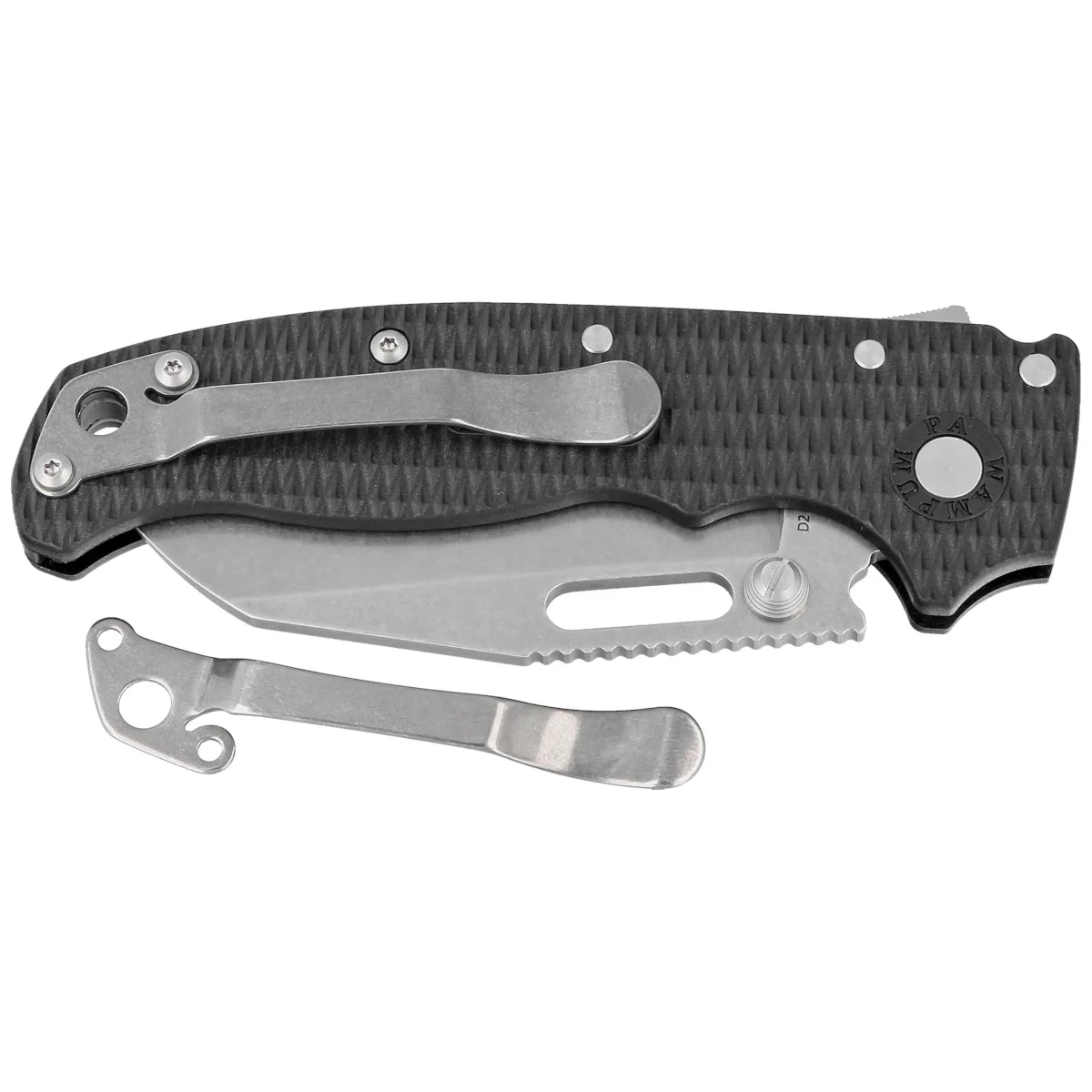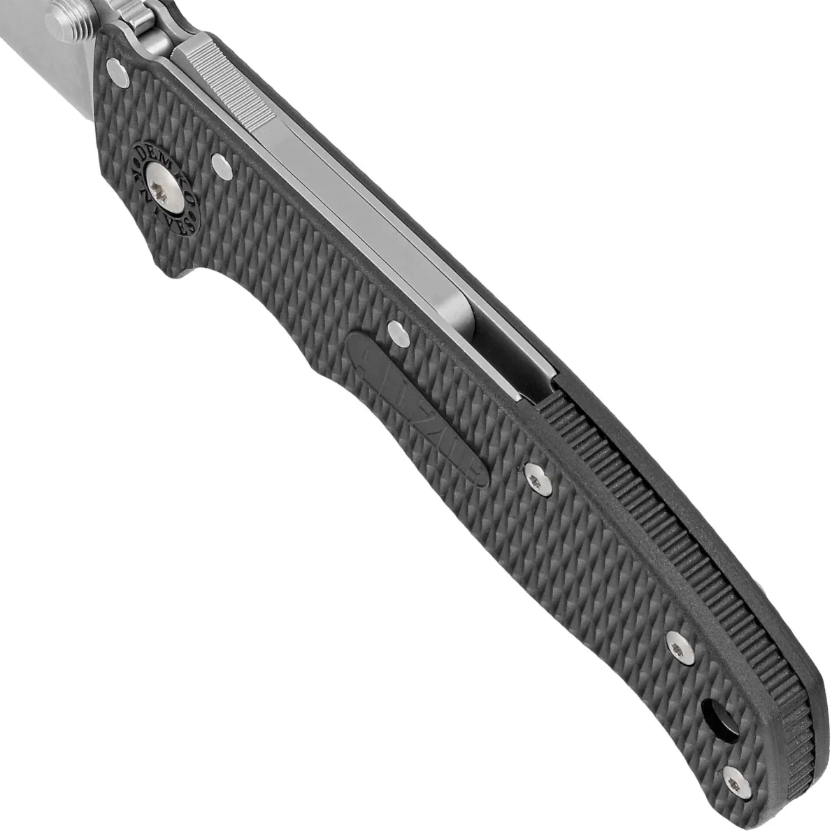 Rękojeść - okładziny z Grivory, praktycznie niezniszczalnego tworzywa niewrażliwego na warunki atmosferyczne, odpornego na chemikalia i uszkodzenia mechaniczne. Fazowane krawędzie okładek eliminują ostre ranty a charakterystyczne teksturowanie powierzchni poprawia pewność uchwytu. Jednopozycyjny, prawostronny klips umożliwia przenoszenie noża w pozycji tip-up, czubkiem ostrza ku górze. W zestawie dodawany jest klips dla leworęcznych.
