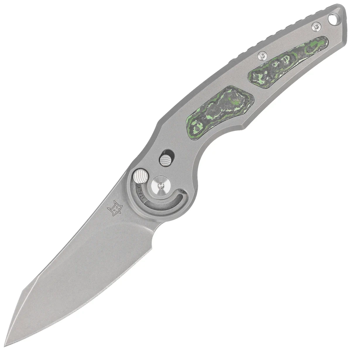 - Jupiter Gray Titanium/Jungle Wear Fatcarbon, Acid Stonewashed, zaprojektowany przez znanego włoskiego knifemakera, Denisa Simonuttiego kompaktowy nóż składany EDC z innowacyjną metodą otwierania i niezwykle bezpieczną blokadą ostrza!