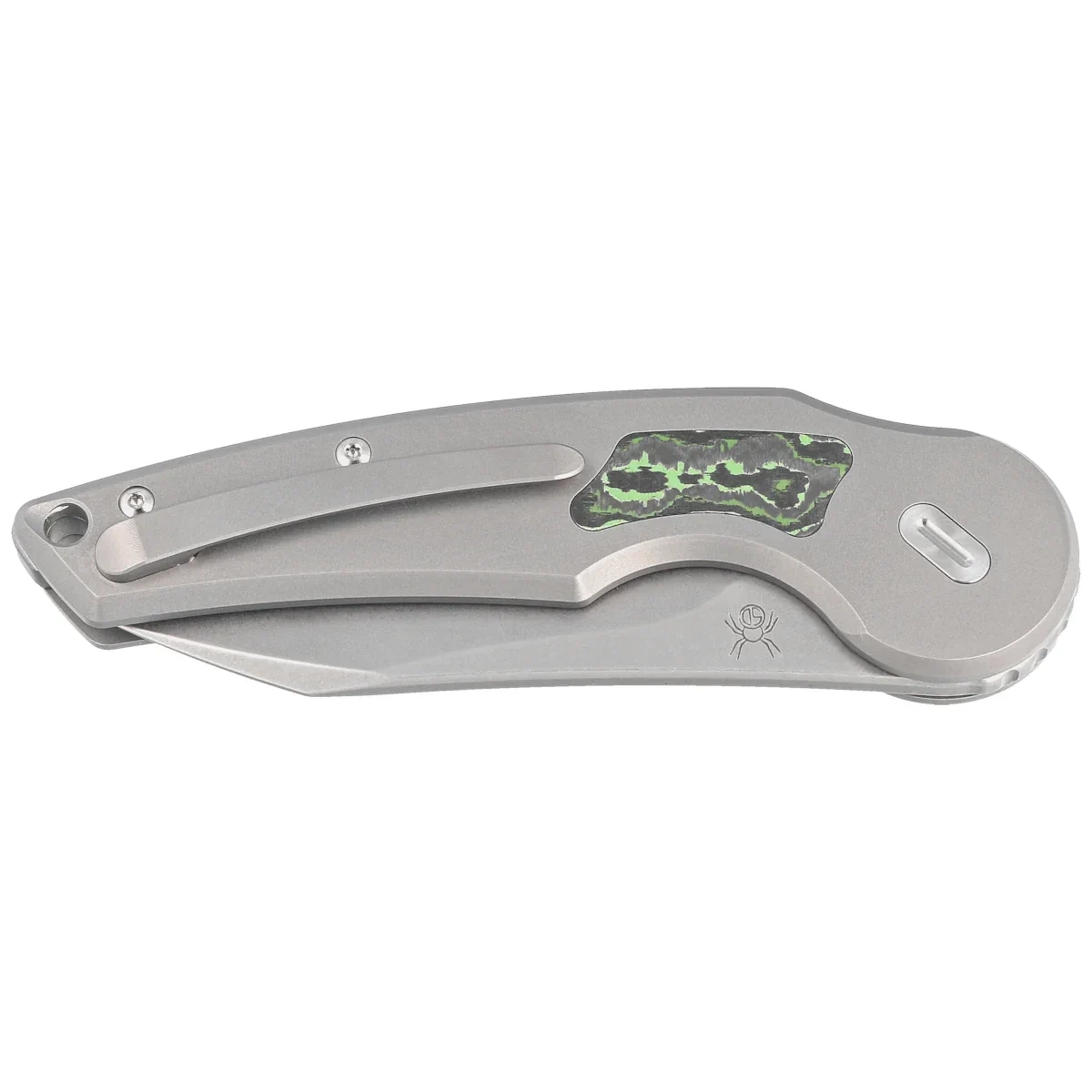 Rękojeść - to grube kawałki szkiełkowanego tytanu 6AL4V, pięknie frezowane przy pomocy obrabiarek CNC. Po obu stronach znajduje się inlay (wkładka) wykonana z Jungle Wear Fatcarbon. Masywny backspacer z piaskowanego tytanu nadaje całej konstrukcji pożądanej sztywności. Prostota i solidność budowy dają pewność wieloletniego użytkowania. Klips jednopozycyjny (prawa), wykonany z tytanu, umożliwia przenoszenie noża w pozycji tip-up. Nad klipsem lanyard hole, otwór do przewleczenia linki ozdobnej lub zabezpieczającej.