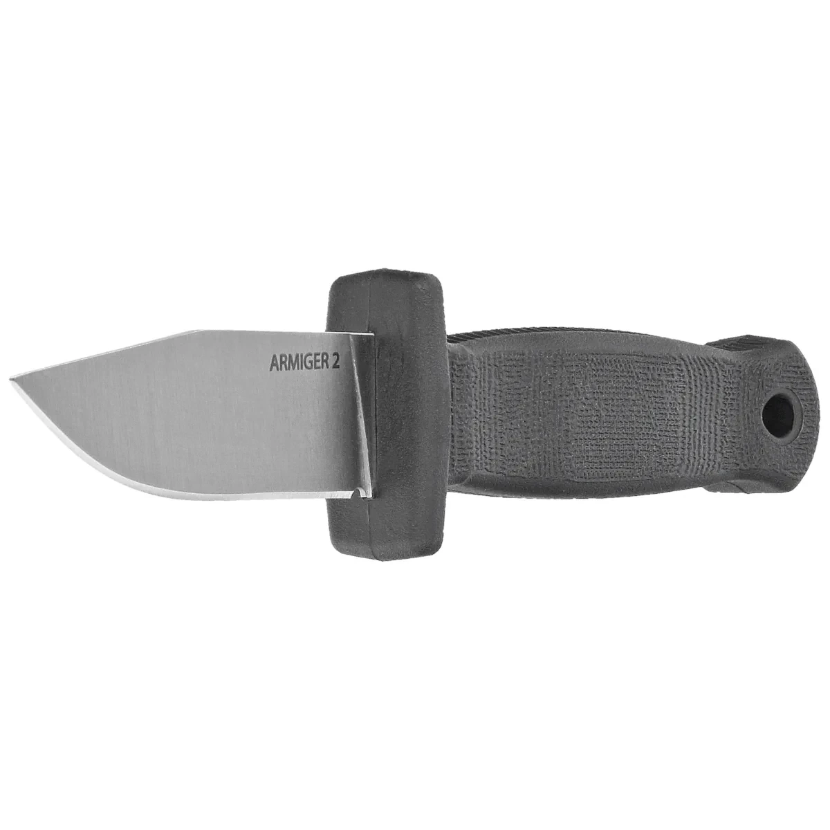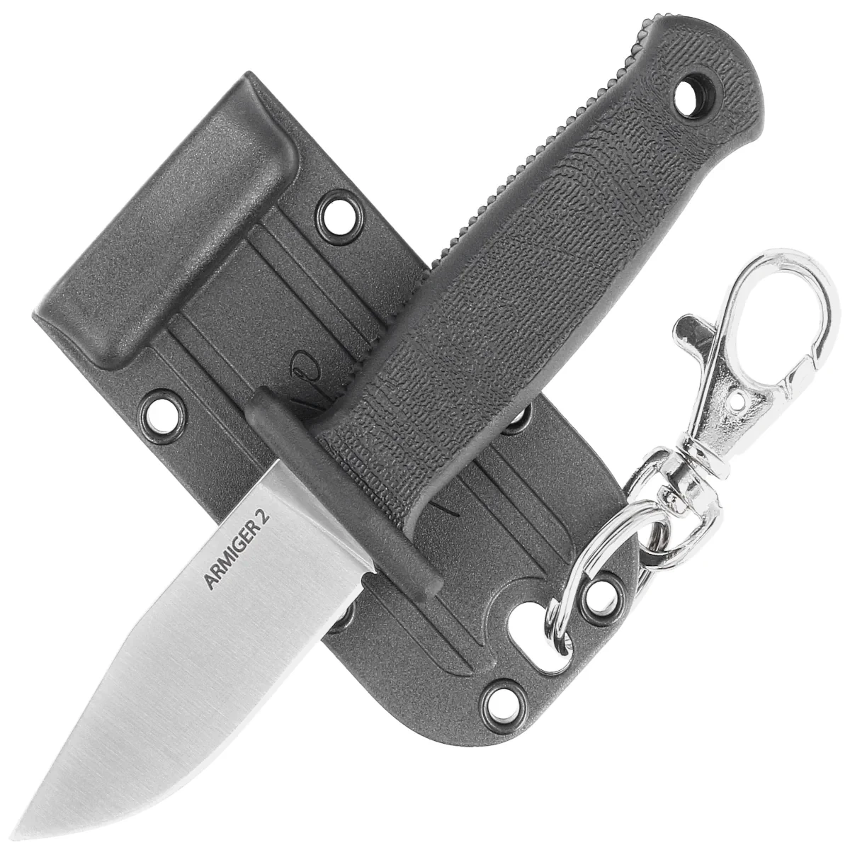 - Armiger 2 Clip Point Black Thermal Plastic Rubber, Satin, kompaktowy nóż typu neck knife. Budowa full tang, wygodna rękojeść zapewniająca pewny chwyt. Pochwa z kydexu z karabińczykiem. Projekt byłego projektanta firmy Cold Steel, Andrew Demko.