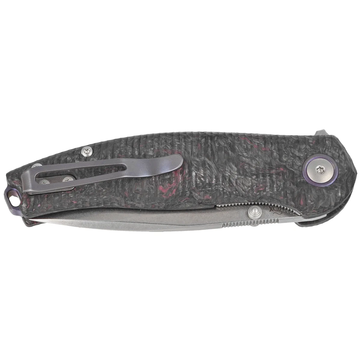 Rękojeść - okładziny z kompozytu Purple Dark Matter Fat Carbon, kunsztownie frezowane, aby uzyskać fakturę na rękojeści. Połączone ze sobą przy pomocy frezowanego obrabiarkami CNC backspacera, dzięki czemu nóż zachowuje pożądaną sztywność konstrukcji. Backspacer oraz ozdobny pierścień wokół pivota tzw. pivot collar wykonano z tytanu anodyzowanego na niebiesko. Wykonane z przodu podcięcie na palce (fore finger groove) poprawia pewność uchwytu, tworząc jednocześnie z flipperem gardę zapobiegającą ześlizgnięciu się dłoni na ostrze. Prawostronny, jednopozycyjny tytanowy klips deep carry, pozwala przenosić dyskretnie nóż w pozycji tip-up (czubkiem do góry). Na końcu rękojeści lanyard hole, otwór na linkę.