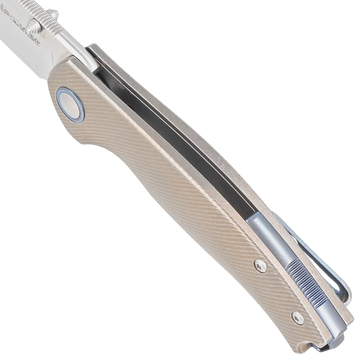 Głownia - typu Drop Point o wyraźnie zaznaczonym brzuchu ostrza, wykończona eleganckim satynowaniem. Solidna grubość ostrza w połączeniu z wysokim płaskim szlifem (Flat Grind) daje doskonałą geometrię krawędzi tnącej oraz ekstremalną wydajność cięcia. Łożyska kulkowe wspomagają płynną pracę mechanizmu otwierającego głownię, którą można otworzyć przy użyciu obustronnego kołka w klindze (dual thumb studs) lub za pomocą szybkiej płetwy flippera (index-finger flipper). Po otwarciu płetwa tworzy mini-gardę zapobiegającą ześlizgnięciu się dłoni na ostrze. Mechanizm blokady liner lock.