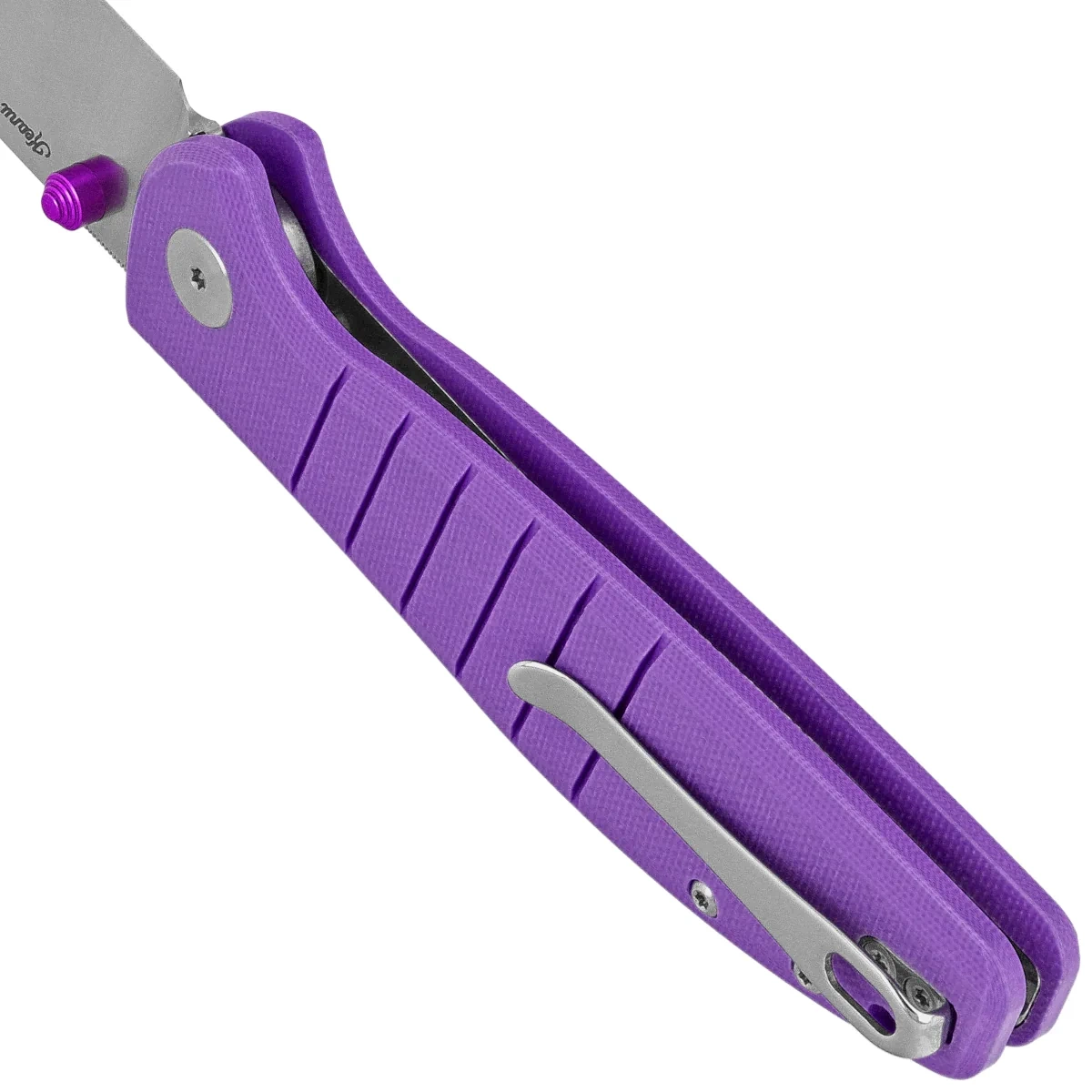 Głownia - typu Drop Point o długiej krawędzi tnącej, wykończona eleganckim satynowaniem. Niewielka grubość klingi w połączeniu z wysokim, płaskim szlifem daje doskonałą geometrię krawędzi tnącej oraz ekstremalną wydajność cięcia. Ceramiczne łożyska kulkowe wspomagają płynną pracę mechanizmu otwierającego klingę, którą można otworzyć za pomocą obustronnego kołka w klindze (dual thumb stud). Kołek został anodyzowany na fioletowo co daje ładny kontrast z kolorem klingi. Na grzbiecie klingi upper jimping, karbowane oparcie pod kciuk. Całość blokowana jest solidną blokadą button lock.