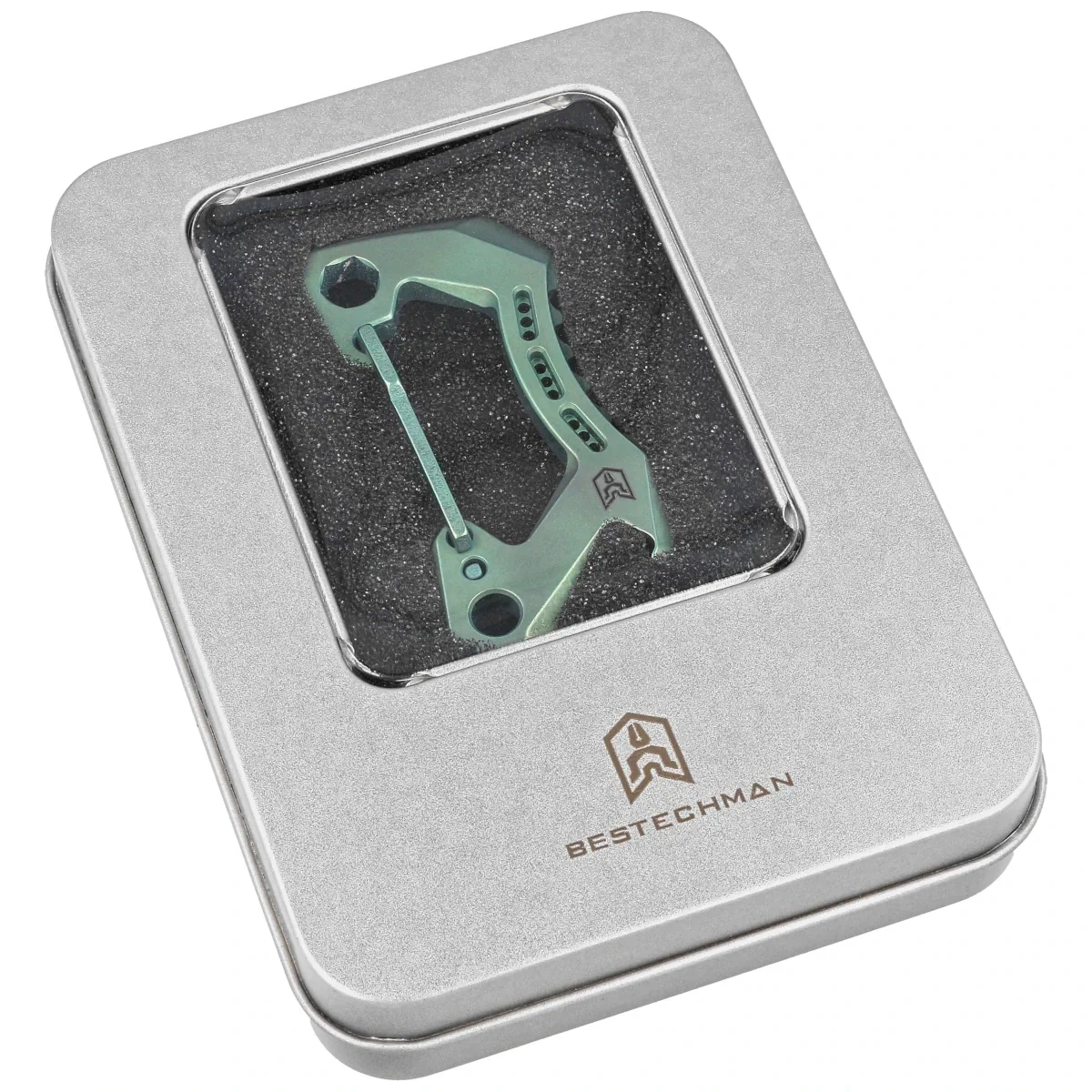 - Bestech Carabiner Green Titanium wykonany z litego niemagnetycznego tytanu karabinczyk o wszechstronnym zastosowaniu. Zawiera otwieracz do butelek i klucz hex mogący służyć jako obsada do bitów. Uniwersalne akcesorium na co dzień!