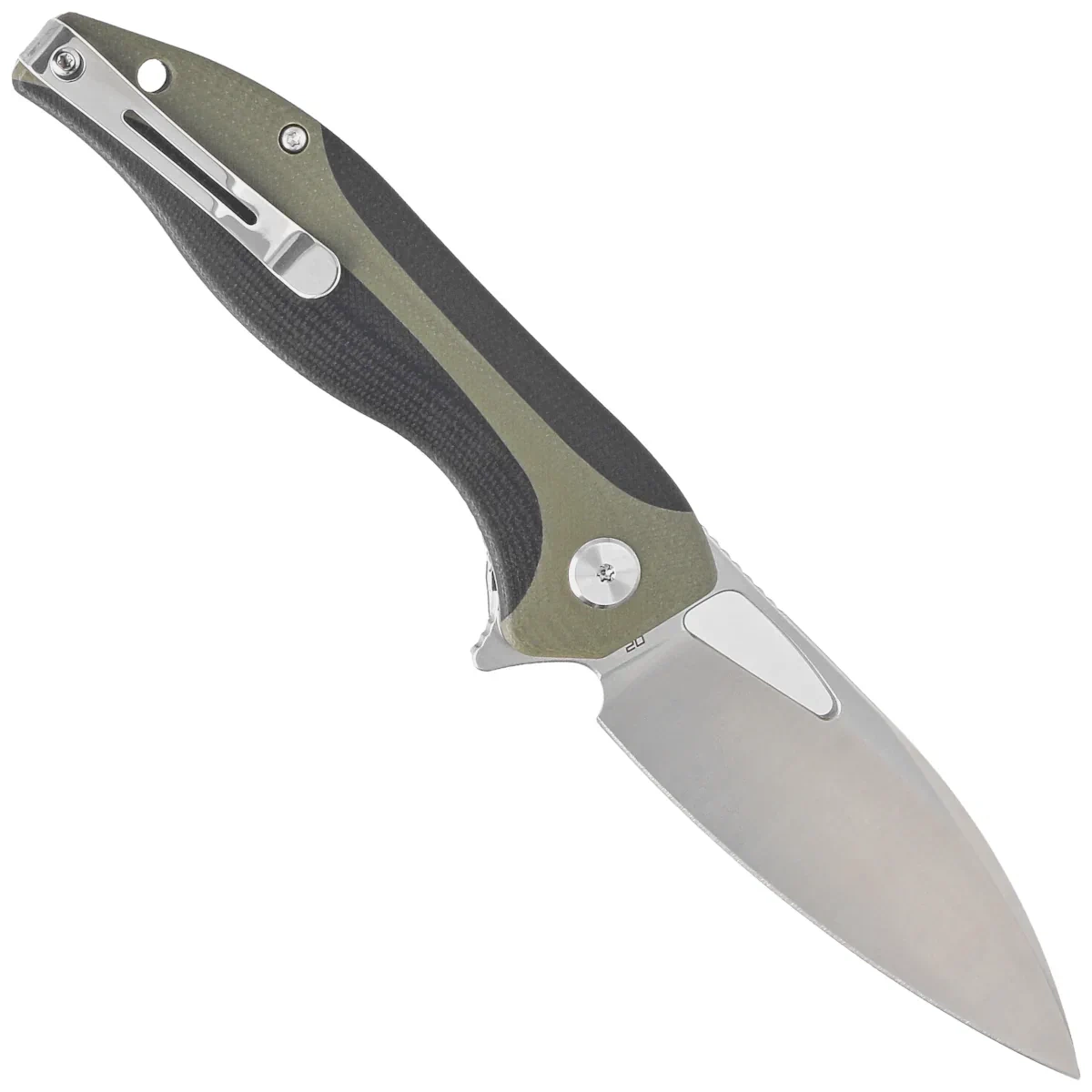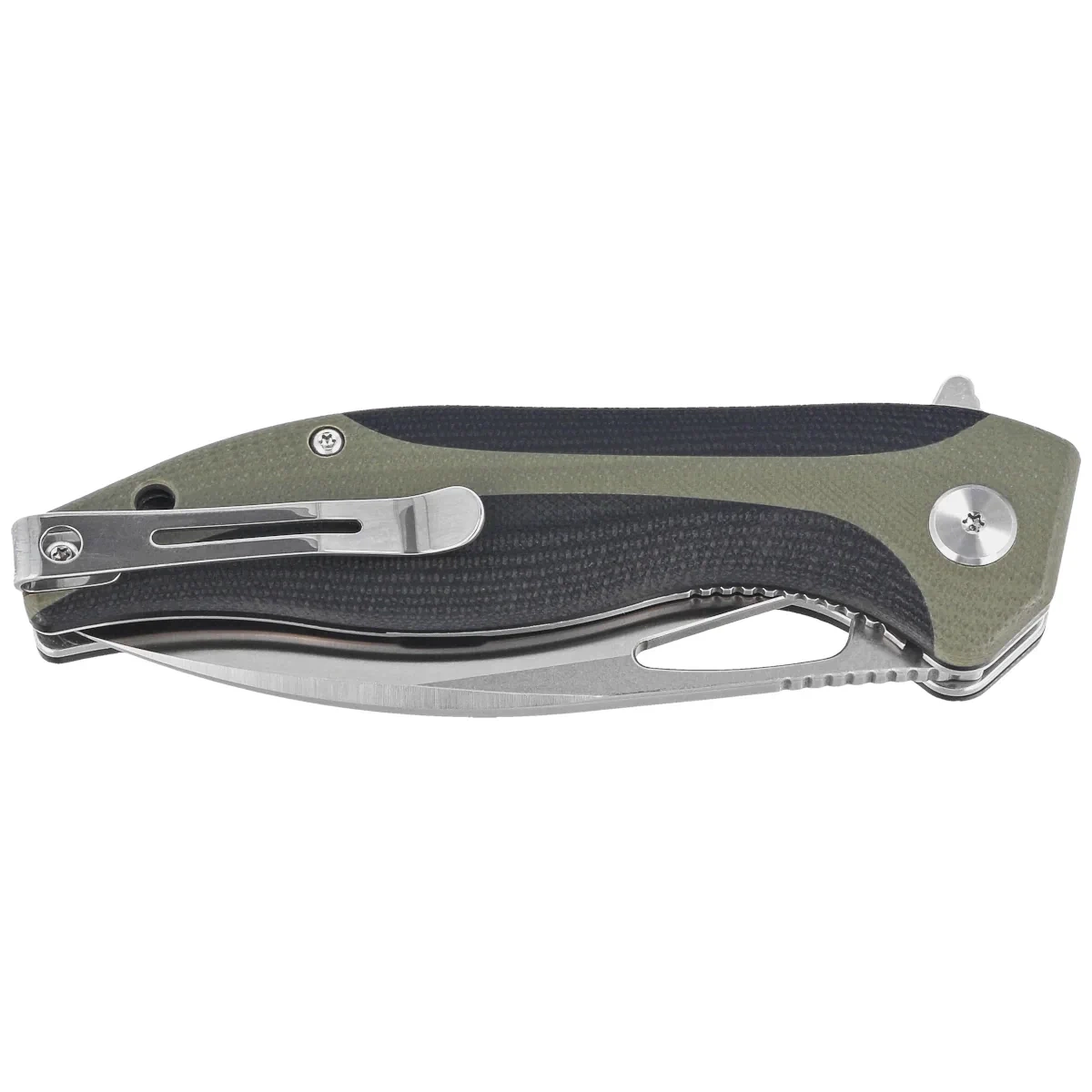 Głownia - typu Drop Point, z efektownym wykończeniem Two Tone, szlif satynowany, pozostała część pokryta Stonewashem. Wydatny brzusiec wydłuża długość krawędzi tnącej w stosunku do długości klingi zbiegając się w kierunku ostrego jak igła czubka noża. Grubość klingi zapewnia wysoką wytrzymałość podczas gdy wysoki, płaski szlif daje doskonałą geometrię krawędzi tnącej oraz ekstremalną wydajność cięcia. Łożyska kulkowe wspomagają otwarcie ostrza za pomocą szybkiej płetwy flippera (index-finger flipper) po otwarciu pełniącej funkcję jelca. Nóż możemy otworzyć również przy pomocy otworu w głowni. Fragment grzbietu klingi pokryto upper jimping, karbowanym oparciem pod kciuk ułatwiającym kontrolę nad nożem. Całość blokowana jest sprawdzoną i popularną blokadą liner lock.