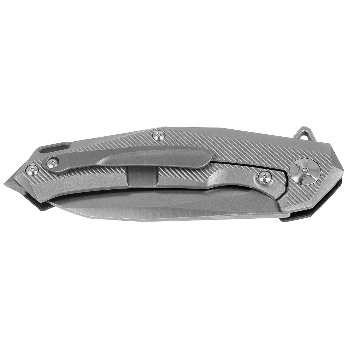Rękojeść - strona prezentacyjna wykonana kompozytu G10, praktycznie niezniszczalnego tworzywa, niewrażliwego na warunki atmosferyczne, odpornego na chemikalia i uszkodzenia mechaniczne. Strona blokady wykonana z tytanu. Fazowane krawędzie okładek eliminują ostre krawędzie dla wygody, a wykonany z przodu podcięcie na palec poprawia ergonomię. Backspacer do którego przymocowano okładziny, gwarantuje sztywność i wytrzymałość całej konstrukcji. Jednopozycyjny (prawa) klips deep carry pozwala przenosić dyskretnie nóż w kieszeni w pozycji tip-up (czubkiem ostrza ku górze). W wystającym fragmencie backspacera lanyard hole, otwór na linkę ozdobną lub asekuracyjną. W tylnej części zbijak do szyb, mogacy również służyć do samoobrony.