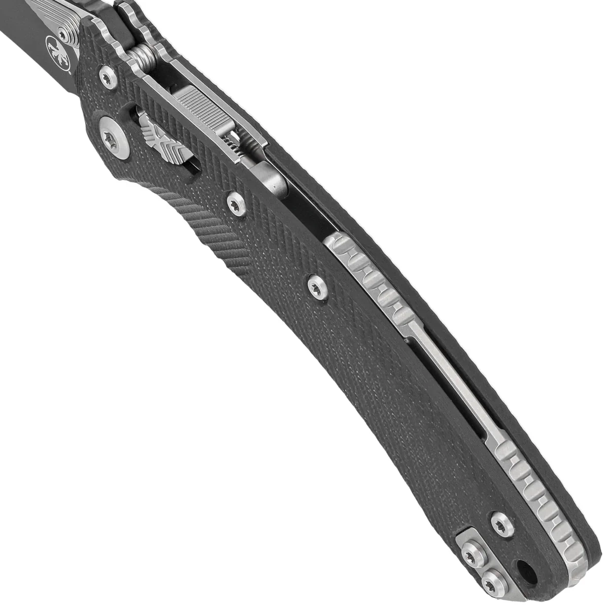 Rękojeść - wykonana z wytrzymałego kompozytu G10, dla lepszego uchwytu pokryta wyfrezowanymi liniami (Fluted). Szeroki suwak blokady z charakterystyczną dla firmy Microtech schodkową strukturą X. Obie okładziny zostały skręcone przy pomocy solidnego, backspacera. Dwustronny (prawa / lewa) tytanowy klips pozwala dyskretnie nosić nóż w pozycji tip-up. Nad klipsem lanyard hole, miejsce na linkę zabezpieczającą lub ozdobną.