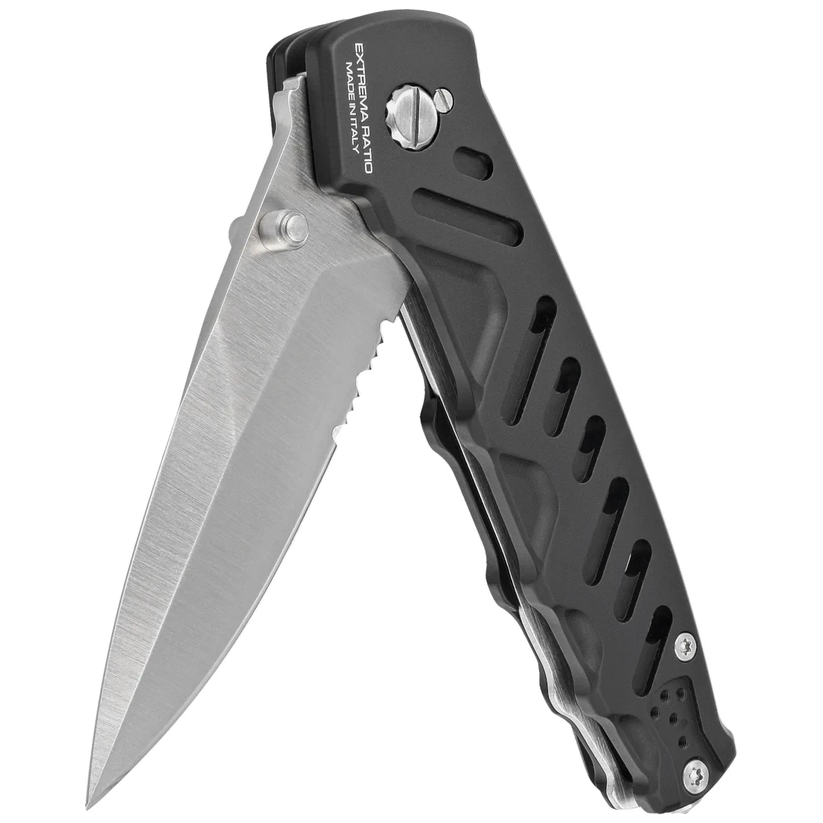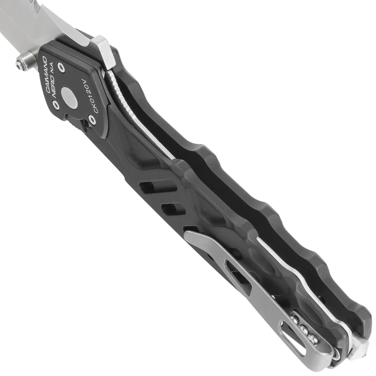 - Caimano Nero N.A. Black Aluminium, Satin, duży, taktyczny nóż składany, Jego nazwa nawiązuje do jednostki Caimani Neri del Piave. Zaprojektowany przez Extrema Ratio dla G.O.I., Gruppo Operativo Incursori, aluminiowa rękojeść, sprawdzona stal Böhler N690.