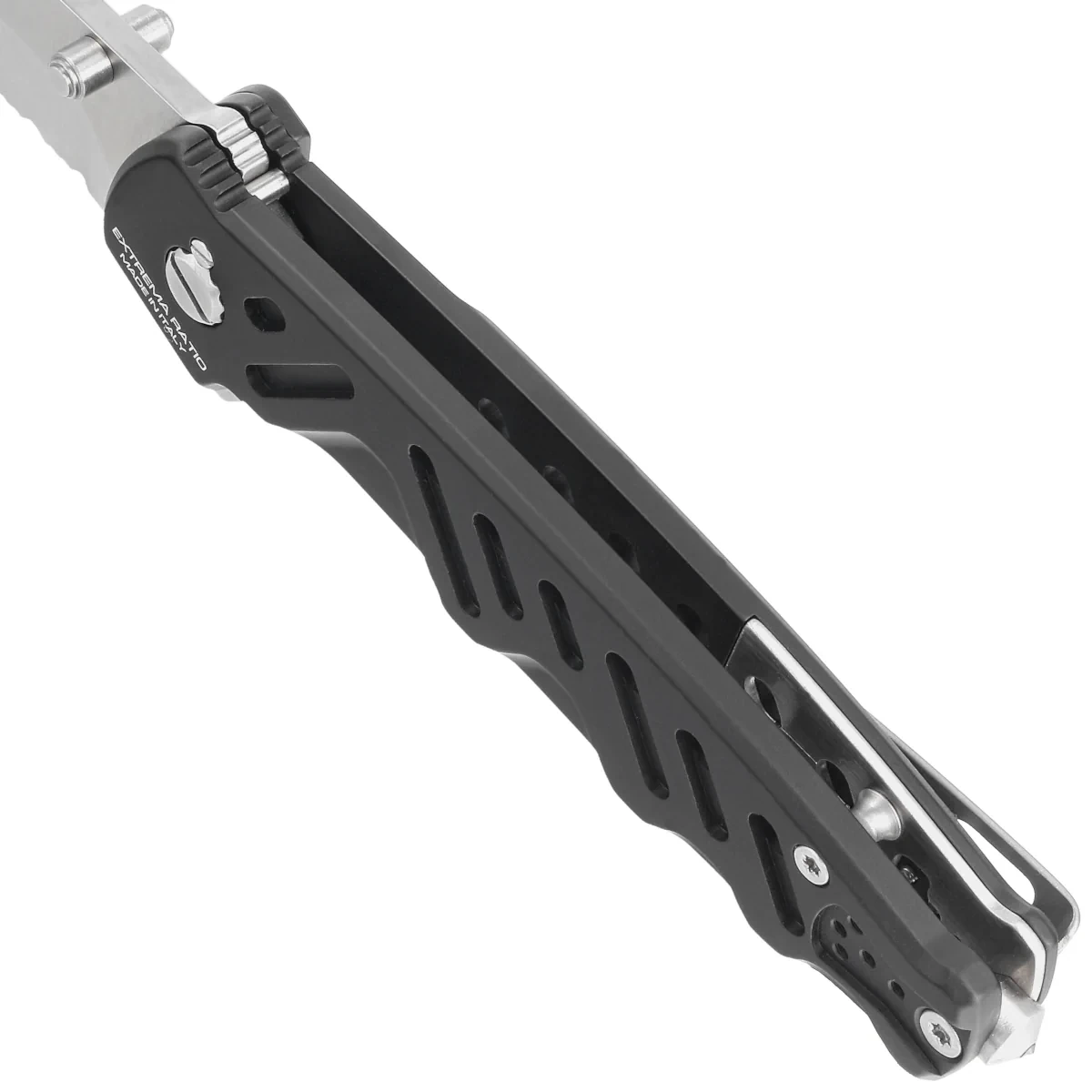 Rękojeść - okładziny z anodyzowanego aluminium zapewniają lekkość i wytrzymałość konstrukcyjną, dla poprawienia chwytu i odciążenia konstrukcji wykonano w nich szereg otworów. Otwarta budowa tzw. open-backed upraszcza czyszczenie i konserwacje. Solidny lewo/prawostronny przekładany tytanowy klips pozwala przenosić nóż głęboko w kieszeni (dyskretnie) w pozycji tip-up (czubkiem do góry). Nowością jest tu możliwość montażu klipsa pod różnymi kątami, dzięki czemu można spersonalizować sposób noszenia pod posiadane oporządzenie. Rękojeść jest zakończona zbijakiem do szyb.