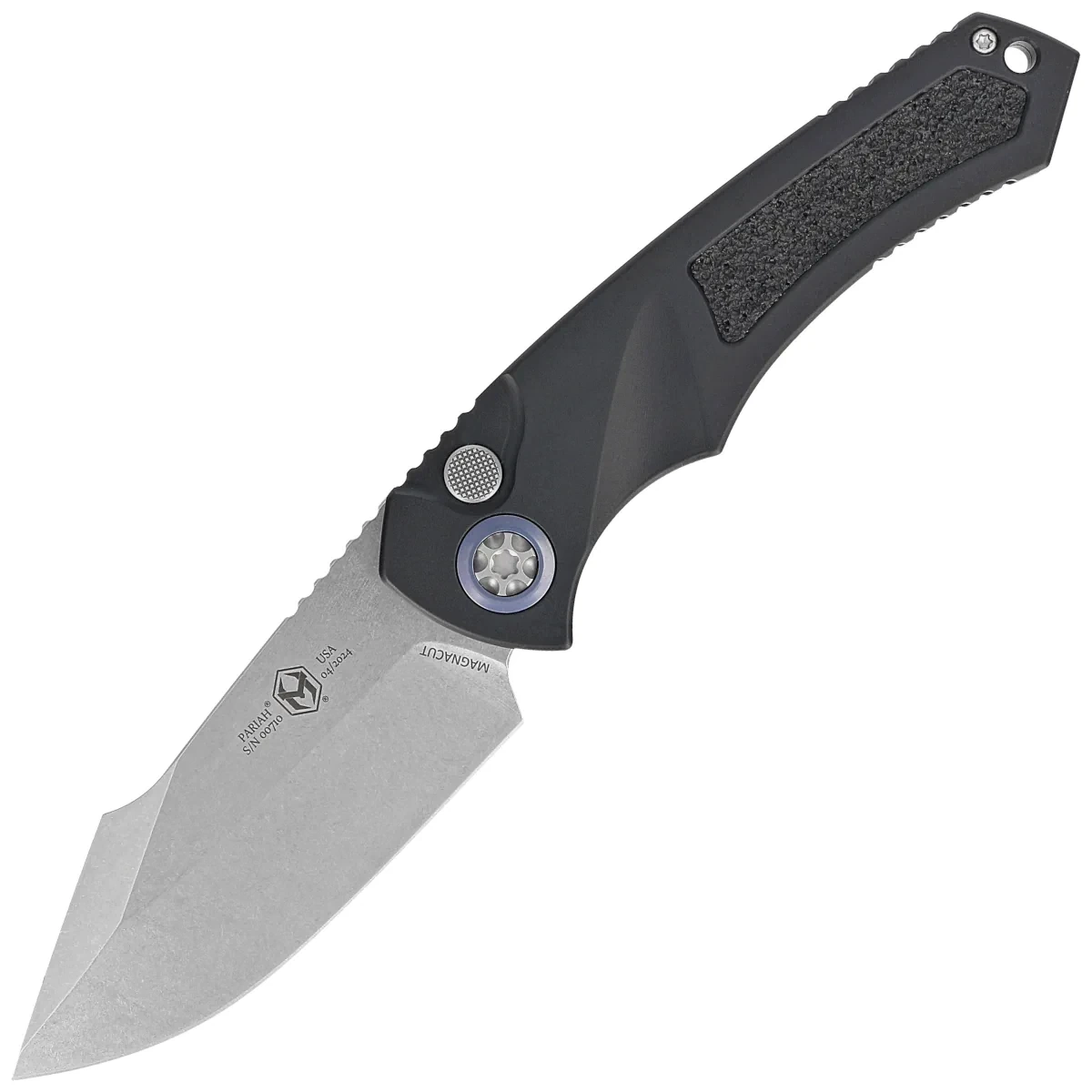 - Pariah Auto Black Aluminium, Stonewashed. Duży nóż automatyczny z serii Pariah. Ergonomiczna, aluminiowa rękojeść, głownia z uznawanej obecnie za najlepszą stal na noże CPM MagnaCut, pokryta czarną powłoką Cerakote. Ten nóż Cię wyróżni!