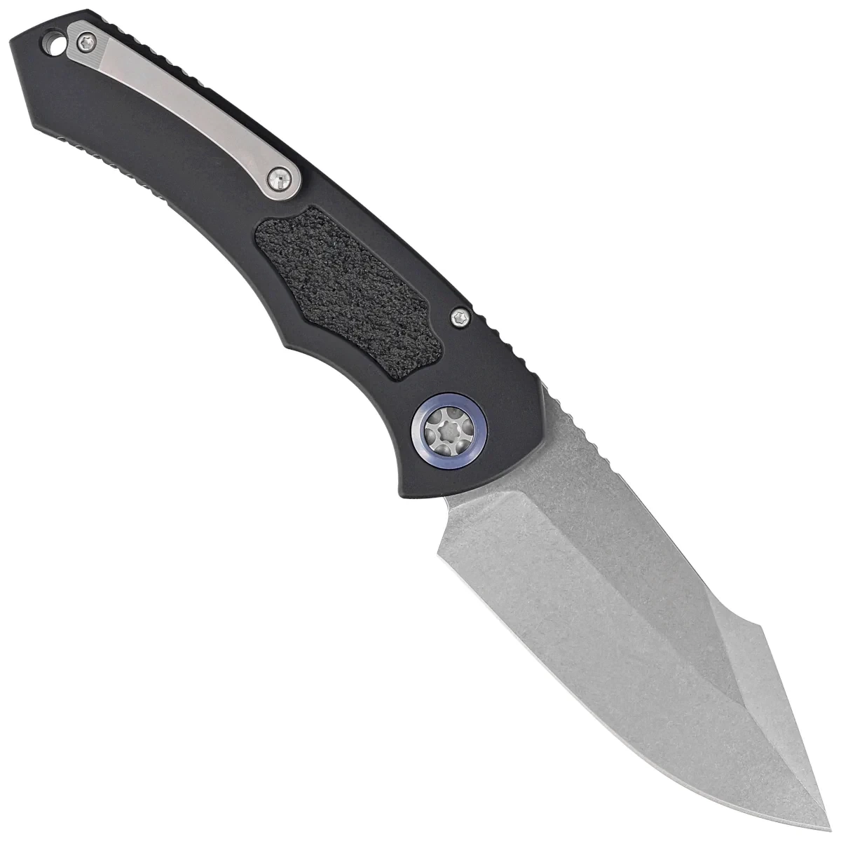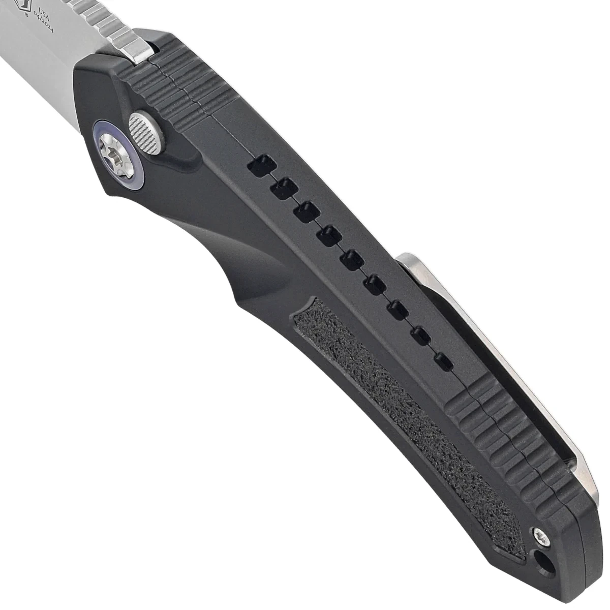 Pariah Auto Black Aluminium, Stonewashed to wyjątkowy nóż automatyczny z serii Pariah, który z pewnością wyróżnia się na tle innych noży. Ergonomiczna, aluminiowa rękojeść z perfekcyjnie dopasowanymi wkładkami z tworzywa o fakturze papieru ściernego zapewnia komfort i pewność chwytu. Głownie wykonano z uznawanej obecnie za najlepszą stal na noże CPM MagnaCut. Zaprojektowany z myślą o wydajności w pracy, łączy w sobie elegancję i funkcjonalność. Wyrafinowane detale czynią go nie tylko praktycznym narzędziem, ale także wyjątkowym dodatkiem, który zasługuje na miejsce w każdej kolekcji noży. Precyzja wykonania jakość materiałów czynią go nie tylko praktycznym narzędziem, ale także dziełem sztuki użytkowej. Bez względu na to, czy jesteś kolekcjonerem noży, czy szukasz niezawodnego narzędzia do codziennego użytku, Pariah Auto to nóż, który z pewnością przekroczy Twoje oczekiwania, to wyjątkowe doświadczenie, które na nowo definiuje, czym może być nóż automatyczny.