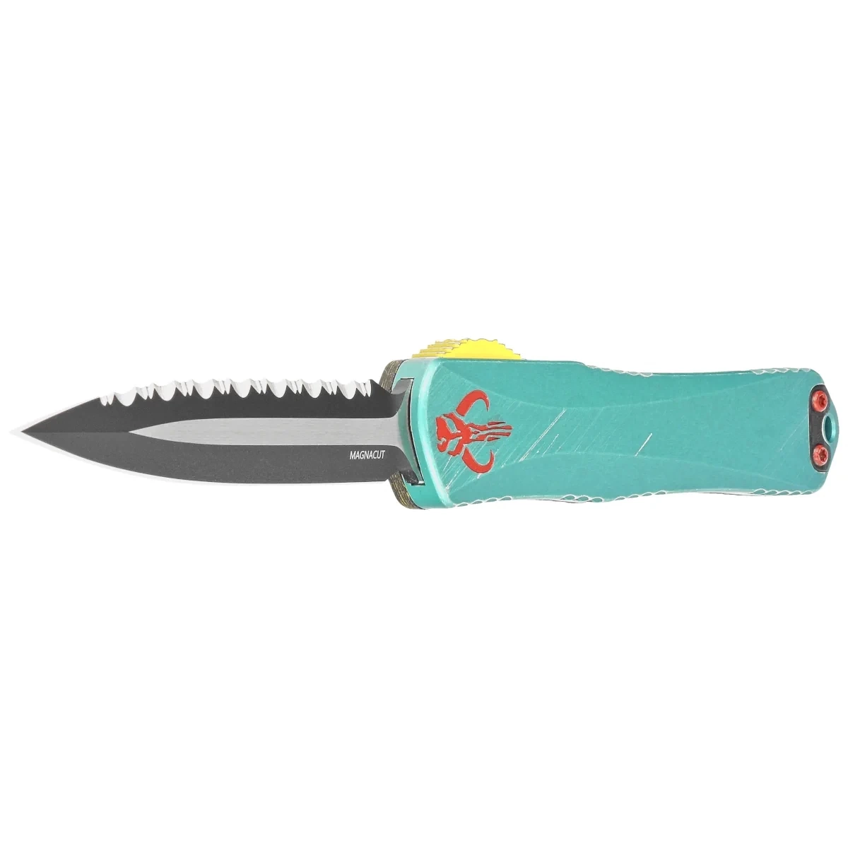 Manticore E Bounty Hunter D/E Green Distressed Aluminium / Camo Carbon, P/S Black DLC/Satin to ultralekki i kompaktowy nóż automatyczny OTF (Out The Front) z serii Manticore. W pełni zasługuje, aby stać się częścią wyposażenia mandaloriańskiego Łowcy Nagród. Kolorystycznie nawiązuje do najsłynniejszej zbroi z Beskaru należącej do legendarnego Boby Fetta. Głęboko wyryty symbol czaszki Mythosaura to symbol przynależności do klanu dumnych wojowników!