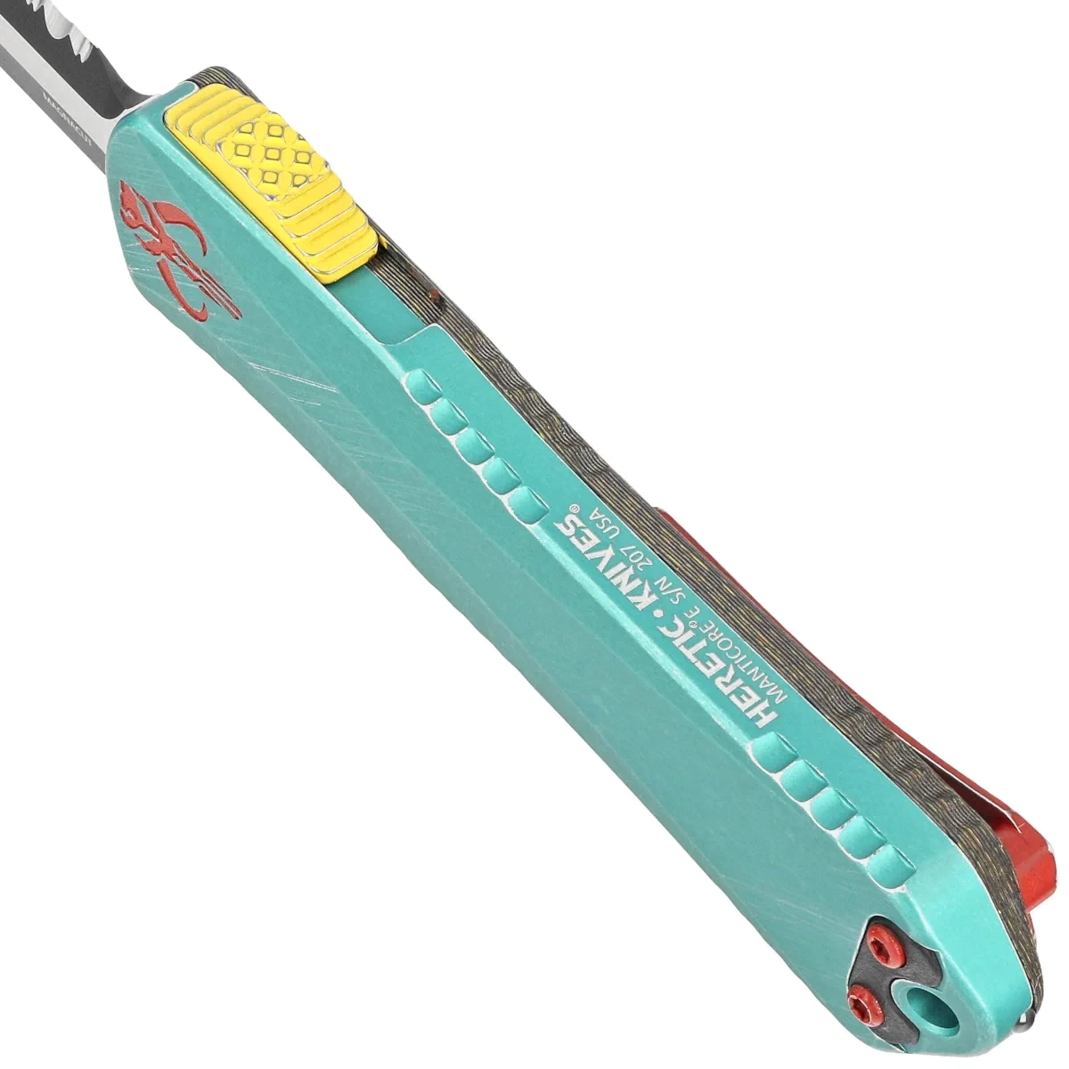 Nóż automatyczny OTF Heretic Manticore E Bounty Hunter D/E Green Distressed Aluminium / Camo Carbon, P/S Black DLC/Satin MagnaCut by Tony Marfione Jr. (H028-10C-BOUNTY)
