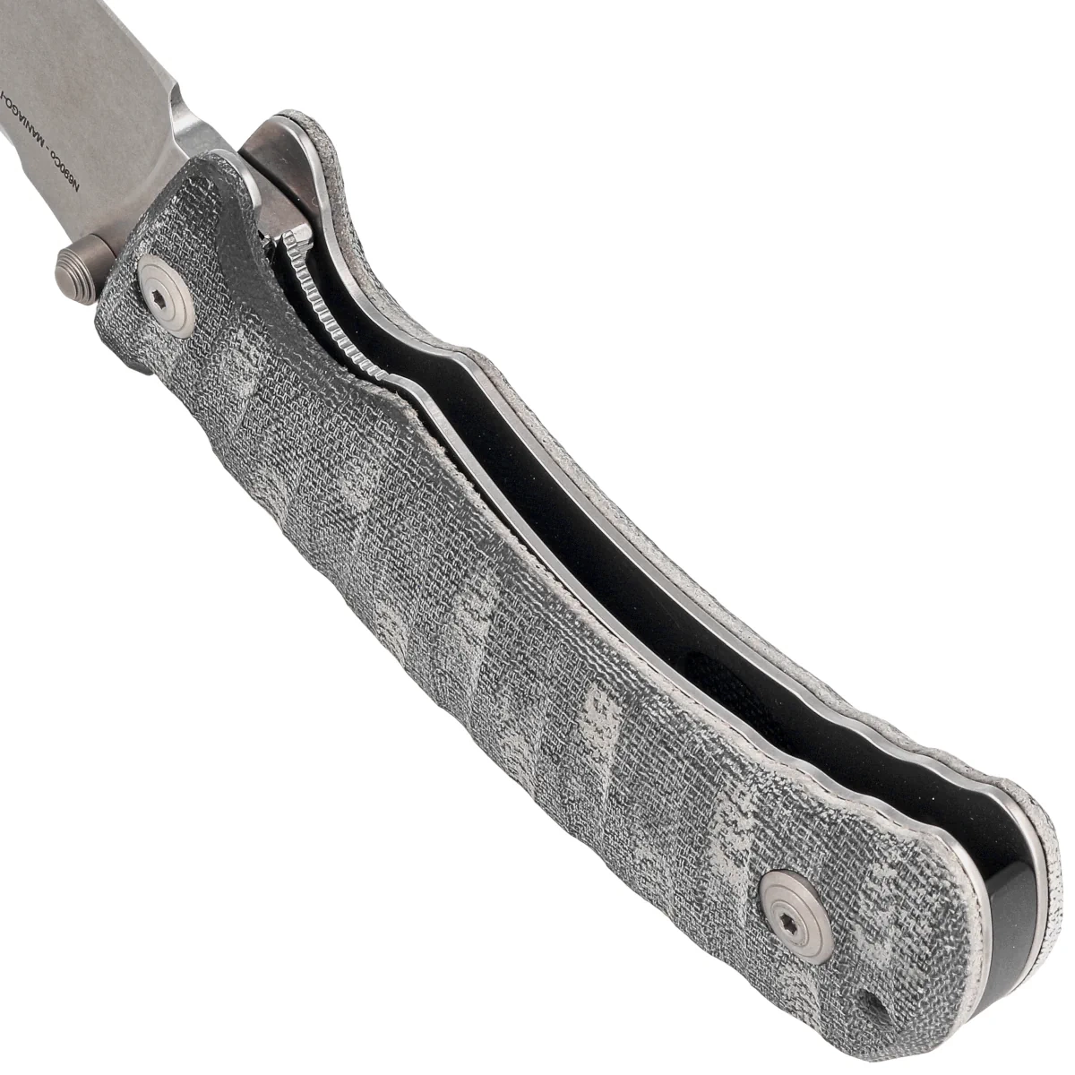 Rękojeść - z jutowej micarty, praktycznie niezniszczalnego tworzywa niewrażliwego na warunki atmosferyczne, odpornego na chemikalia i uszkodzenia mechaniczne. Fazowane krawędzie okładek eliminują ostre krawędzie, a wykonane z przodu podcięcie na palec (fore finger groove) poprawia pewność uchwytu. Okładziny przykręcono do solidnego backspacera, dają pewność prawidłowej sztywności całej konstrukcji. W tylnej części ukryty lanyard hole, otwór do przewleczenia linki zabezpieczającej lub ozdobnej.