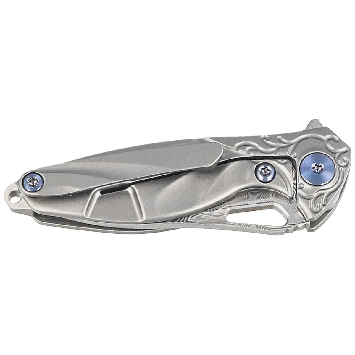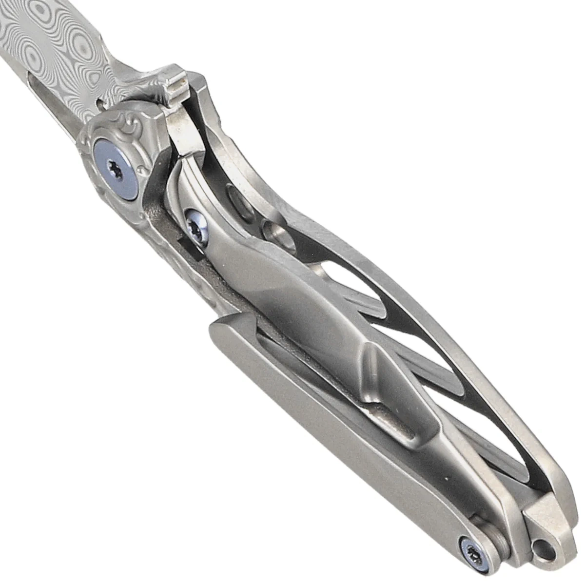 Mini Hummingbird Titanium, Rose Damascus, najwyższej jakości nieduży nóż składany EDC. Głownia z damastu o niepowtarzalnym wzorze. Otwierany szybką płetwą Flippera, okładziny z tytanu, ceramiczne łożyska, pochwa do zawieszania na szyi!