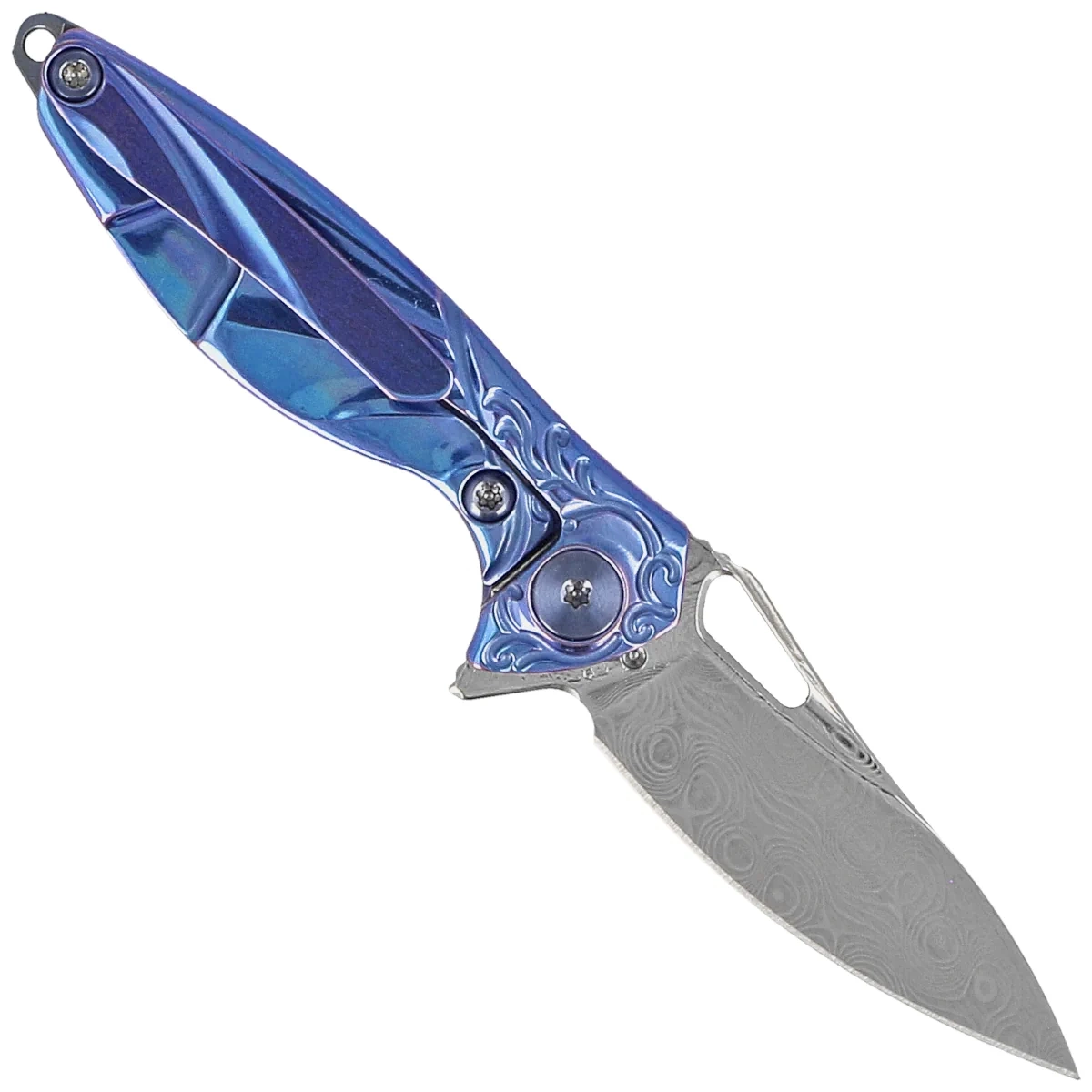 Mini Hummingbird Blue Titanium, Rose Damascus, najwyższej jakości nieduży nóż składany EDC. Głownia z damastu o niepowtarzalnym wzorze. Otwierany szybką płetwą Flippera, okładziny z tytanu, ceramiczne łożyska, pochwa do zawieszania na szyi!