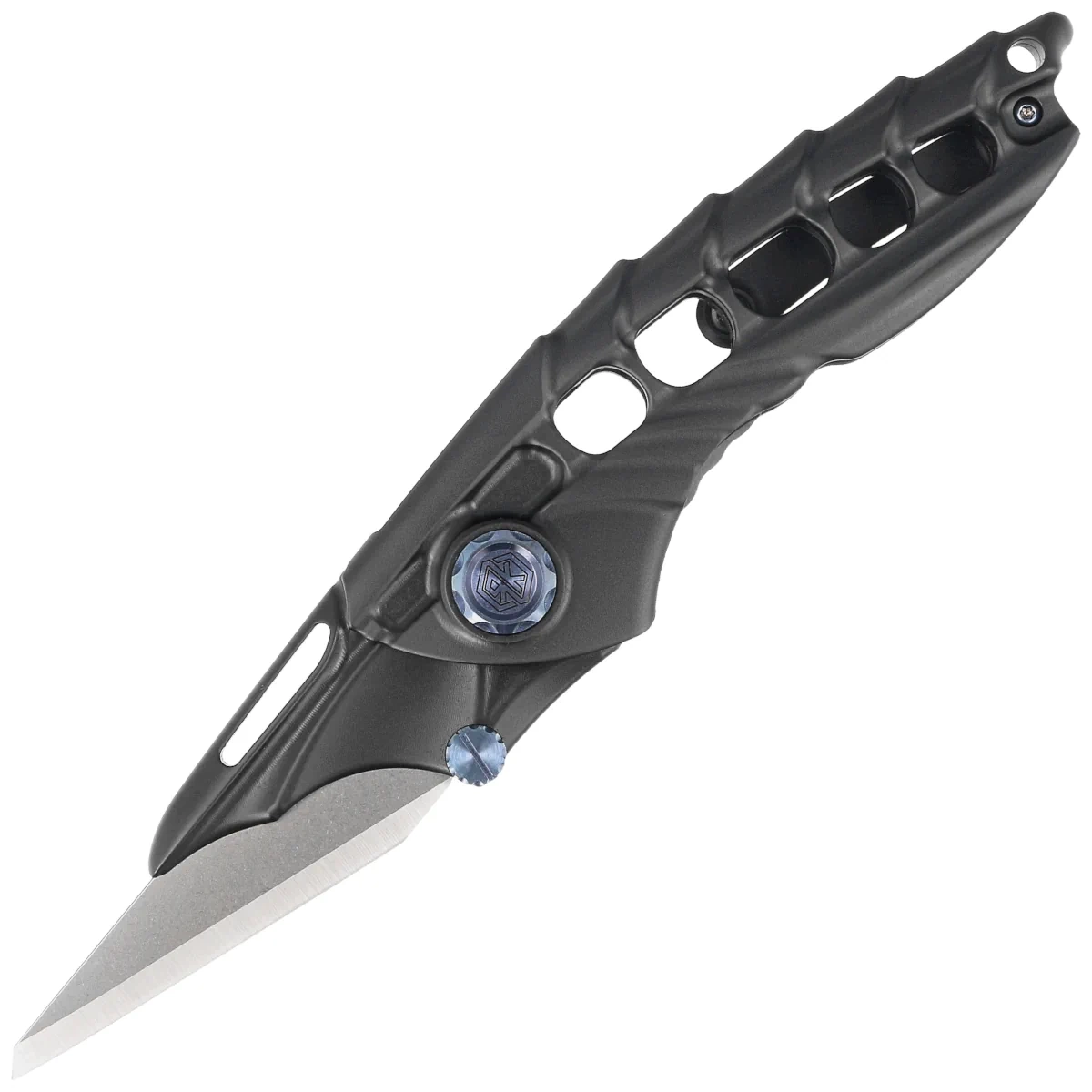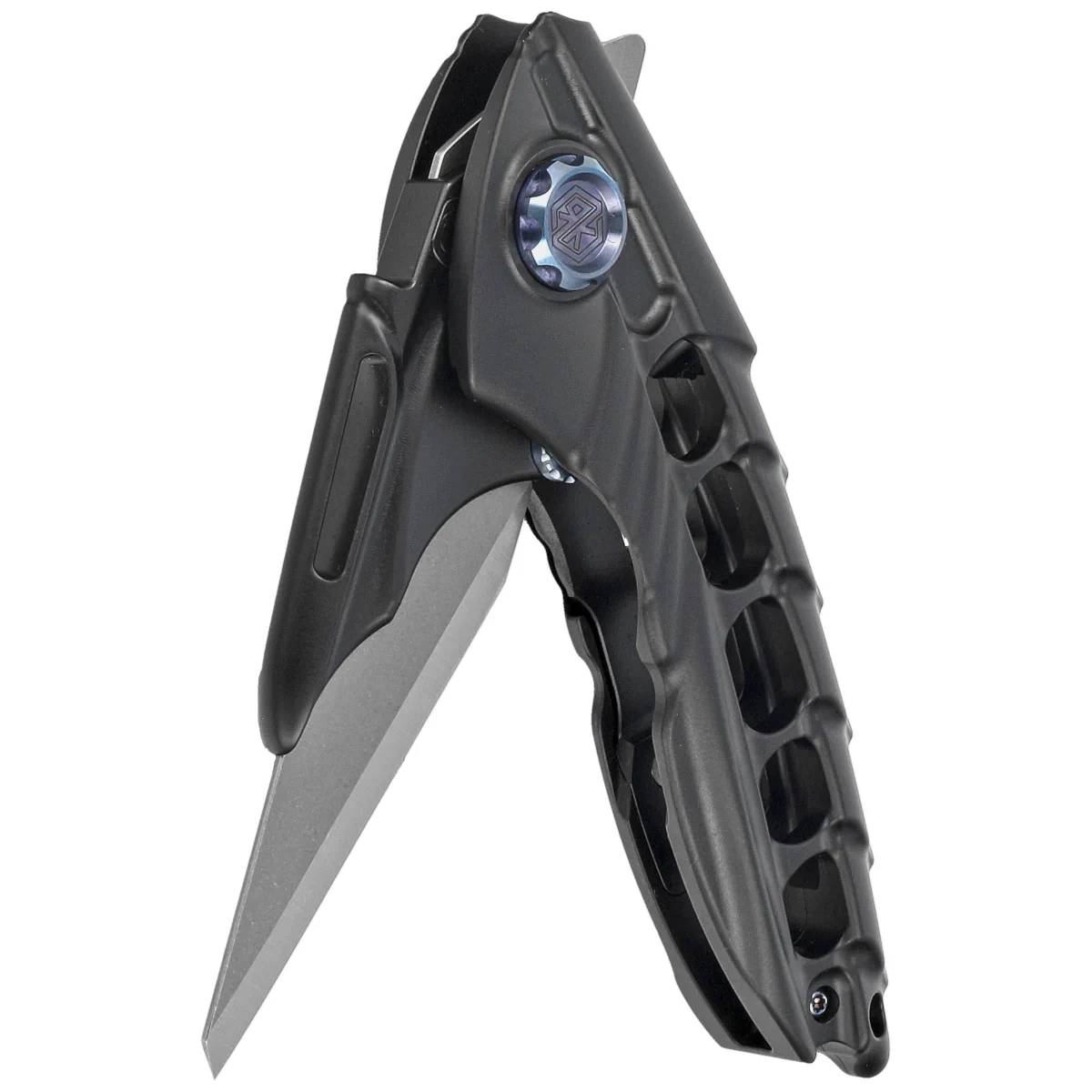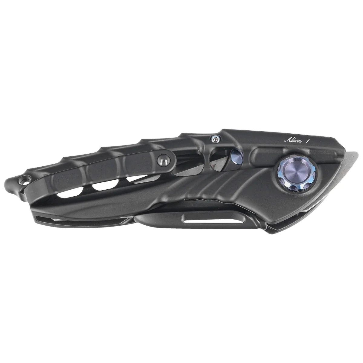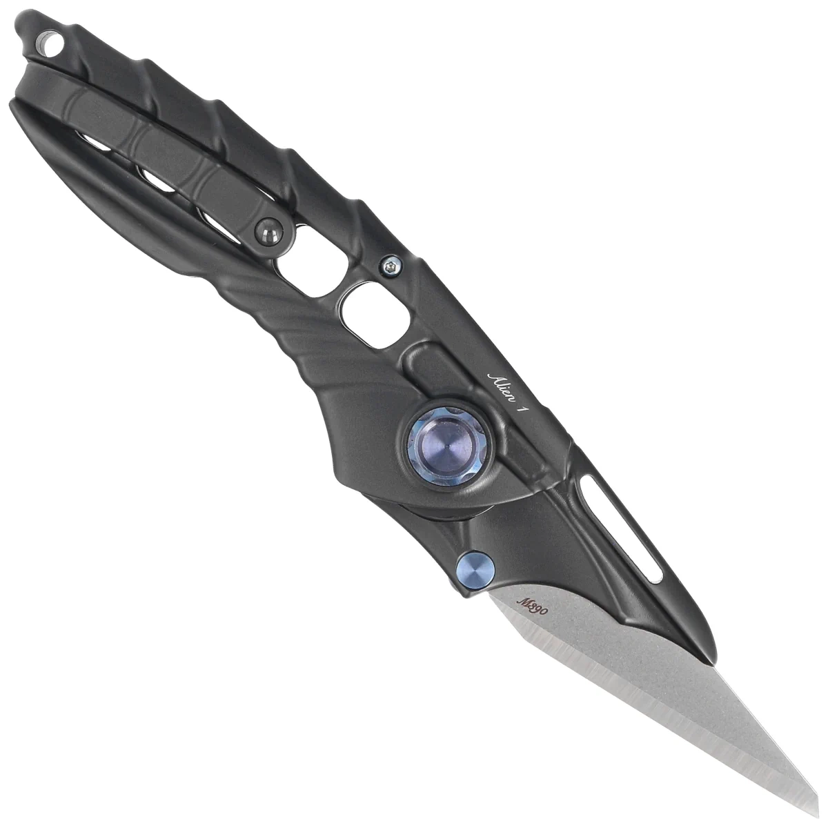 - Alien1 Black DLC Titanium, Satin, nóż składany EDC firmy Rike Knife. Popis możliwości inżynierskich, monolityczna konstrukcja rękojeści z tytanu, szybkie otwieranie przy pomocy front flippera, głownia ze stali Böhler M390, Arcydzieło sztuki użytkowej!
