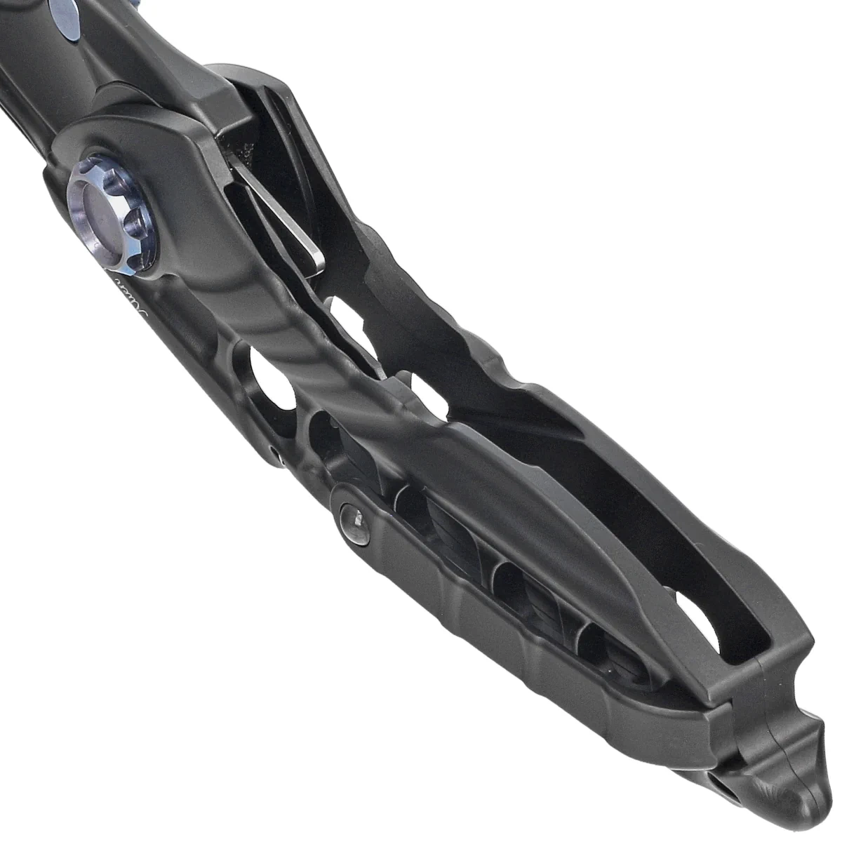 Alien 1 Black DLC Titanium, Satin to niezwykły i ekscentryczny folder. Na pierwszy rzut oka widać jaka jest jego geneza, wygląda jak prace H.R. Gigera do filmu Obcy <ang. Alien>. Monolityczna, frezowaną, sztywną tytanową rękojeść, która wygląda jak kręgosłup lub klatka piersiowa kosmity. Niebieski pivot i śruby, wymienne ostrze.
